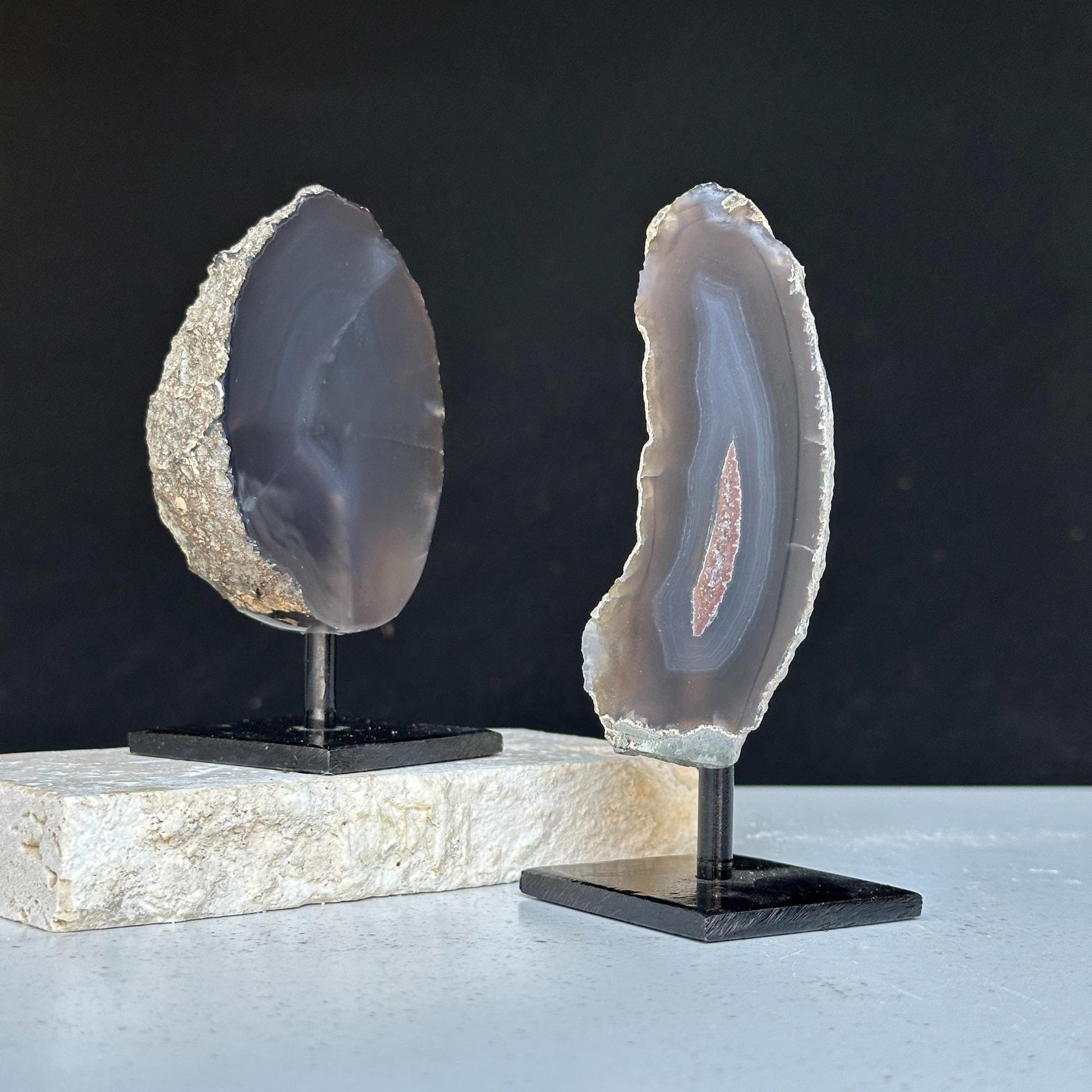 These natural agate crystals with metal stand have the highest quality of the semi precious stones. Its colors are 100% natural. You can opt to buy SETS with 2 pieces, 4 pieces or 6 pieces.