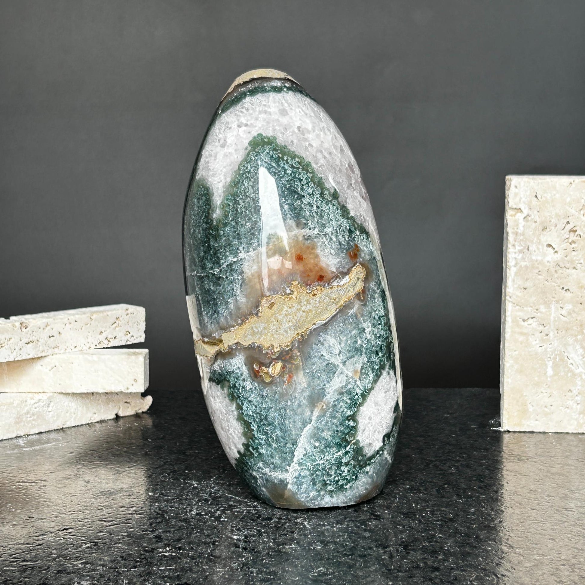 This agate and amethyst quartz geode cave has the highest quality of the semi precious stones. It's a stunning decor crystal with amazing agate edges.