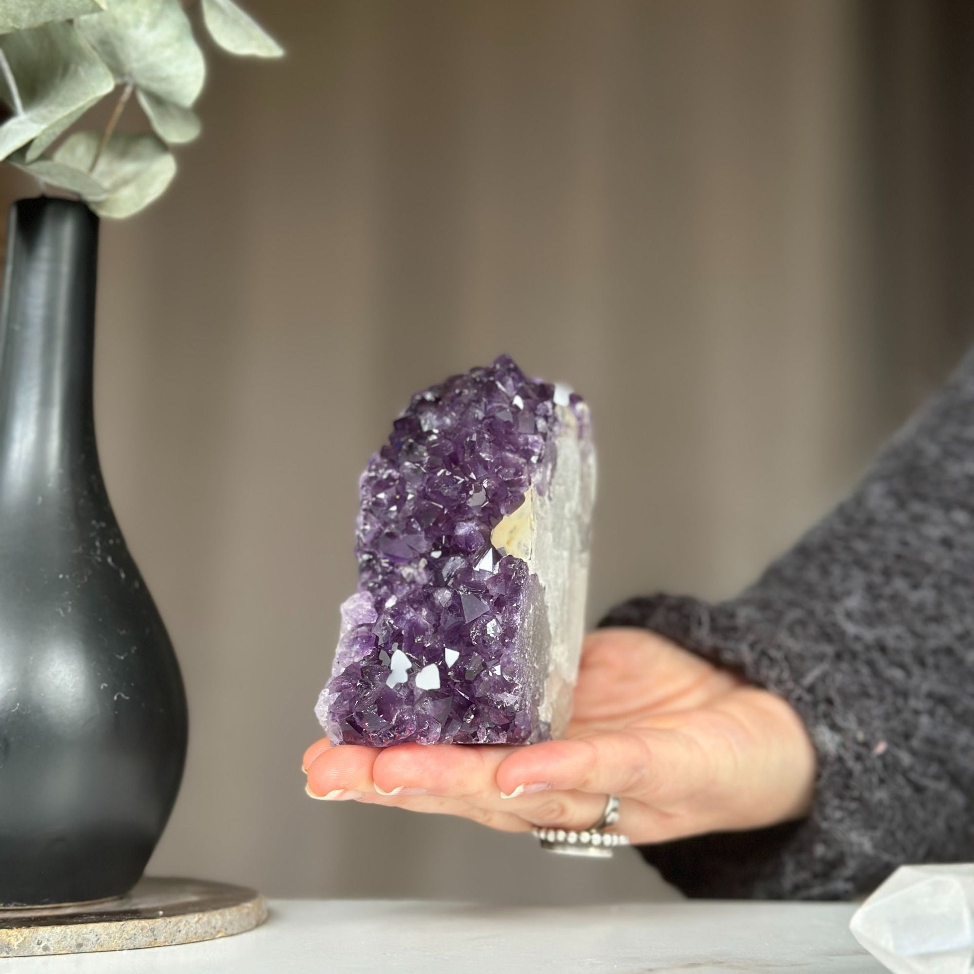 This amethyst cathedral geode has the highest quality of the semi precious stones. It's a unique self standing crystal cluster form Uruguay.