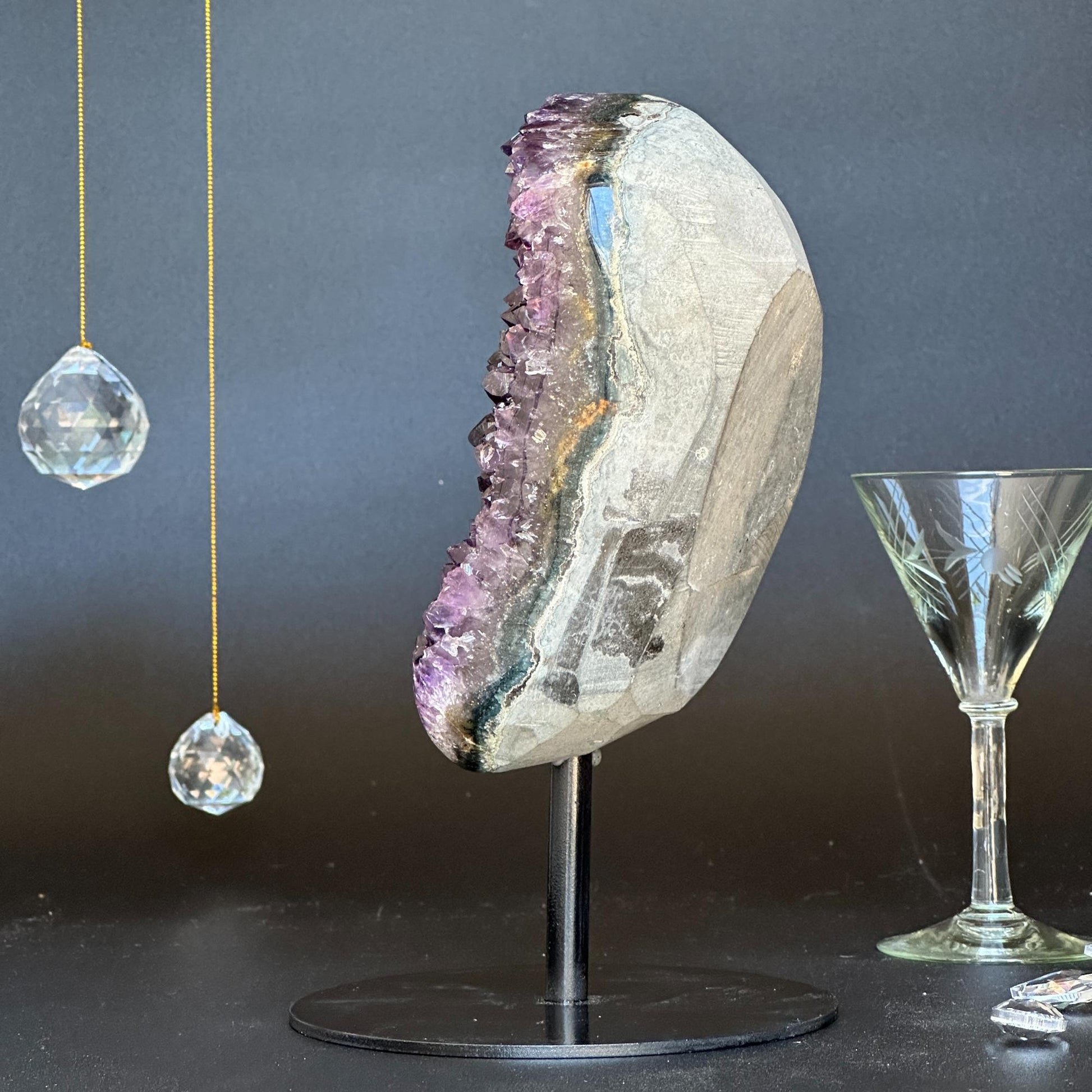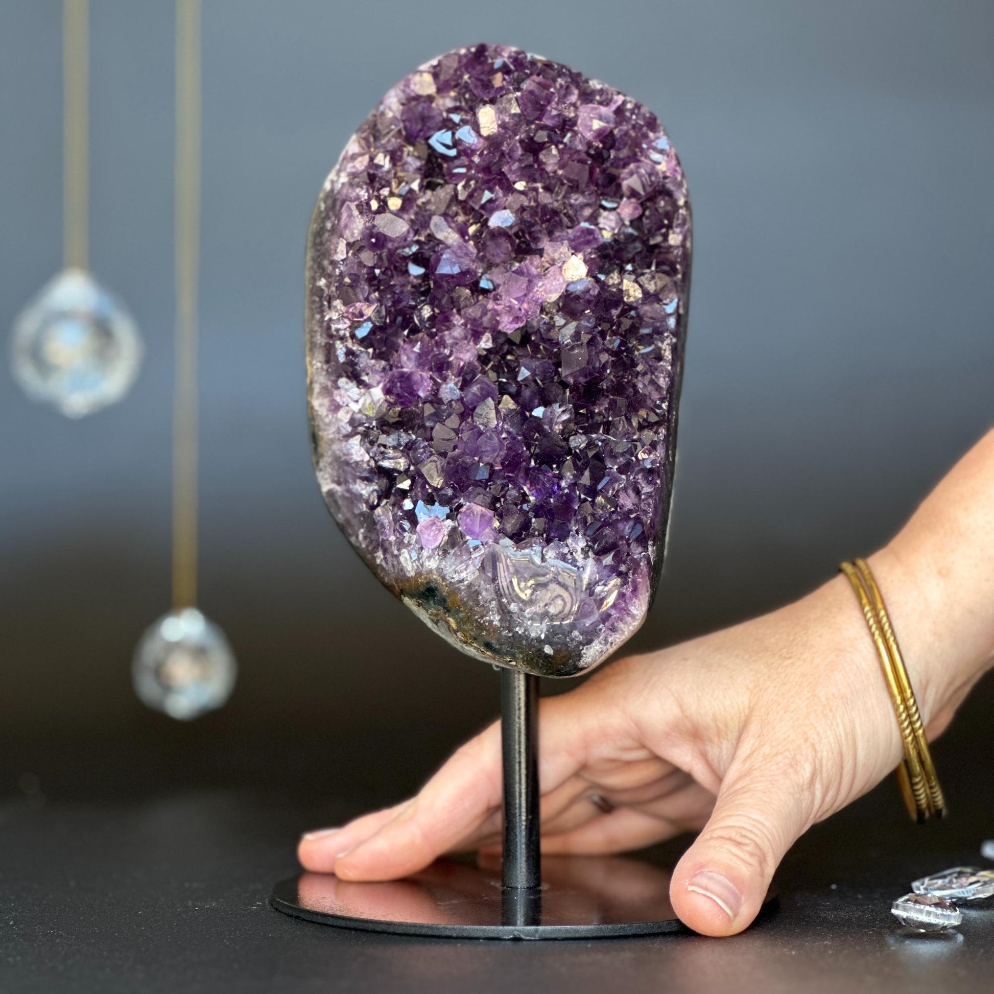 This incredible Amethyst with metal stand has the highest quality of the semi precious stones. Its colors are 100% natural.