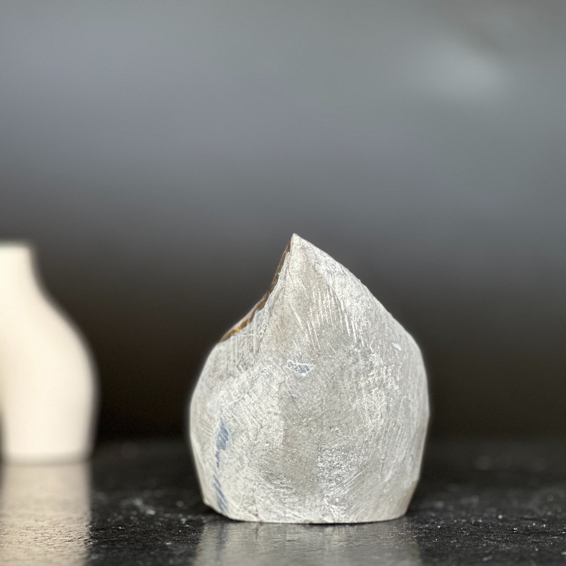 This amethyst and agate crystal flame is perfect for displaying in a reception table or desk.This flame was carefully polished at edges to show the wonderful agate formations, in shades of grey and brown.