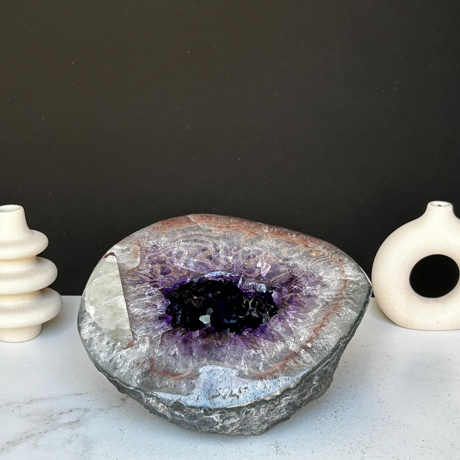 This crystal piece is made from natural amethyst stone from Uruguay. It was carefully polished at the edges to show the wonderful agate formations, in shades of brown.