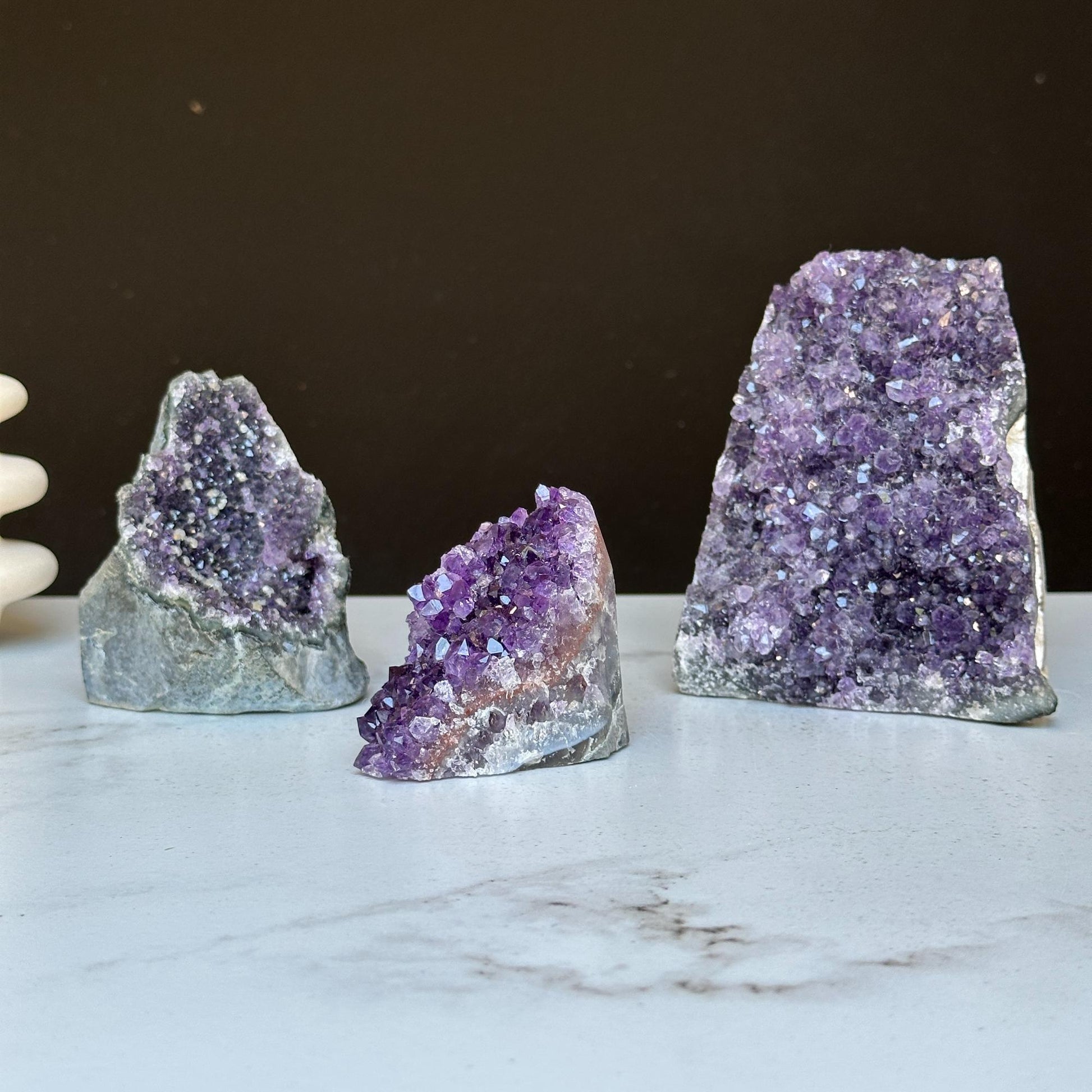 This set of amethysts crystals clusters has the highest quality of the semi precious stones. It's an amethyst geode set perfect for home decoration.