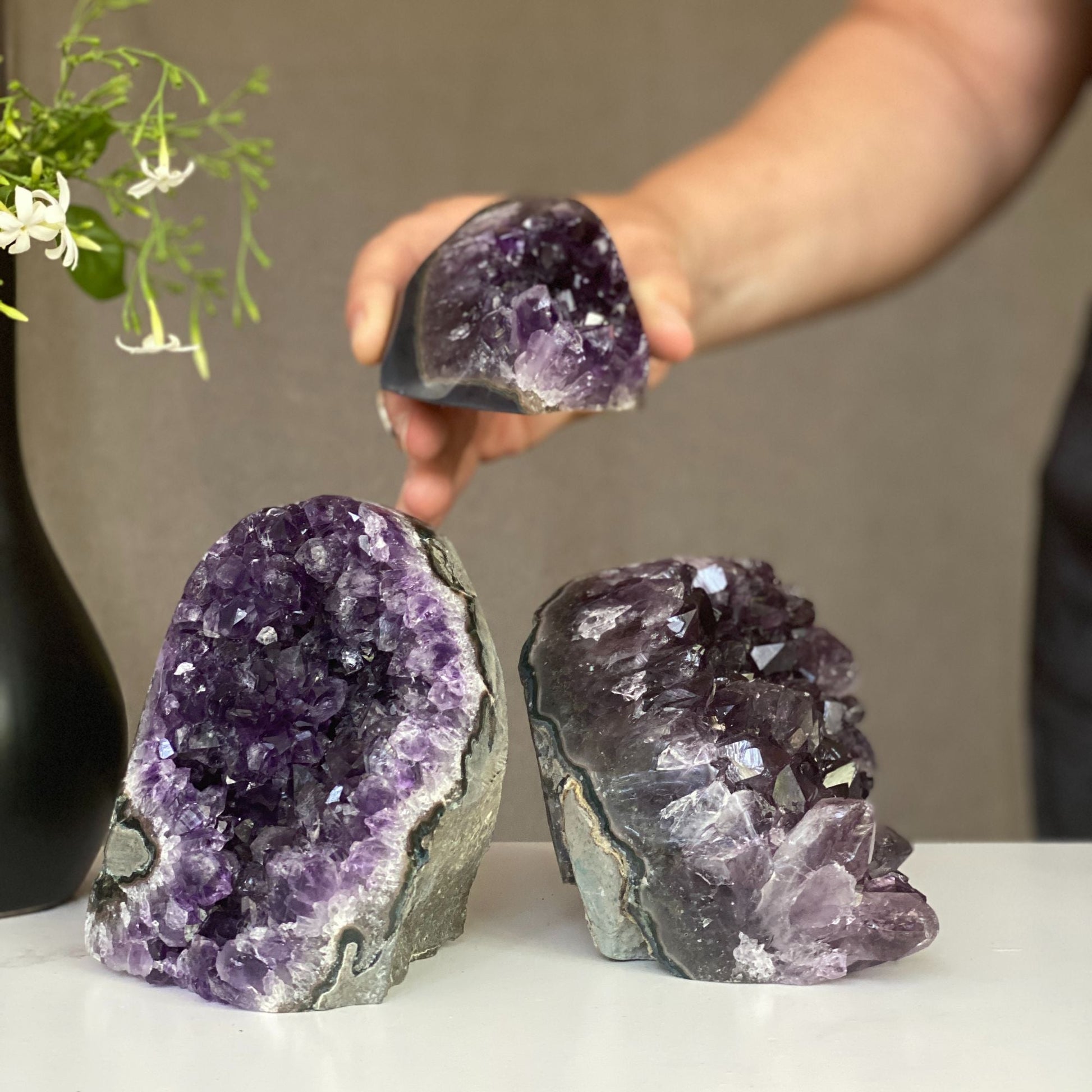 This set of 3 amethyst geode clusters has the highest quality of the semi precious stones. It's perfect for home decoration or meditation altar.