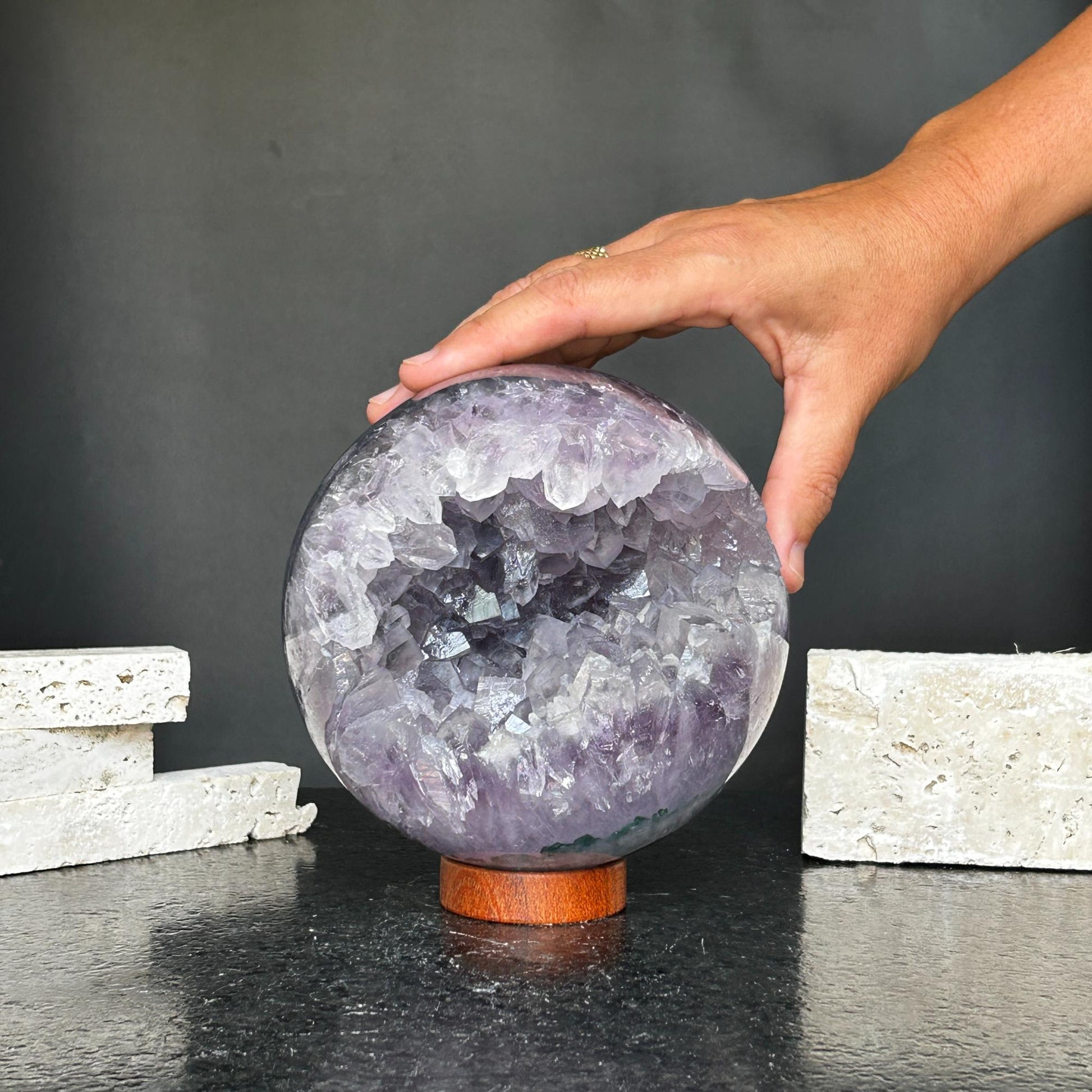 This extra large amethyst sphere has the highest quality of the semi precious stones. Its colors are 100% natural.
