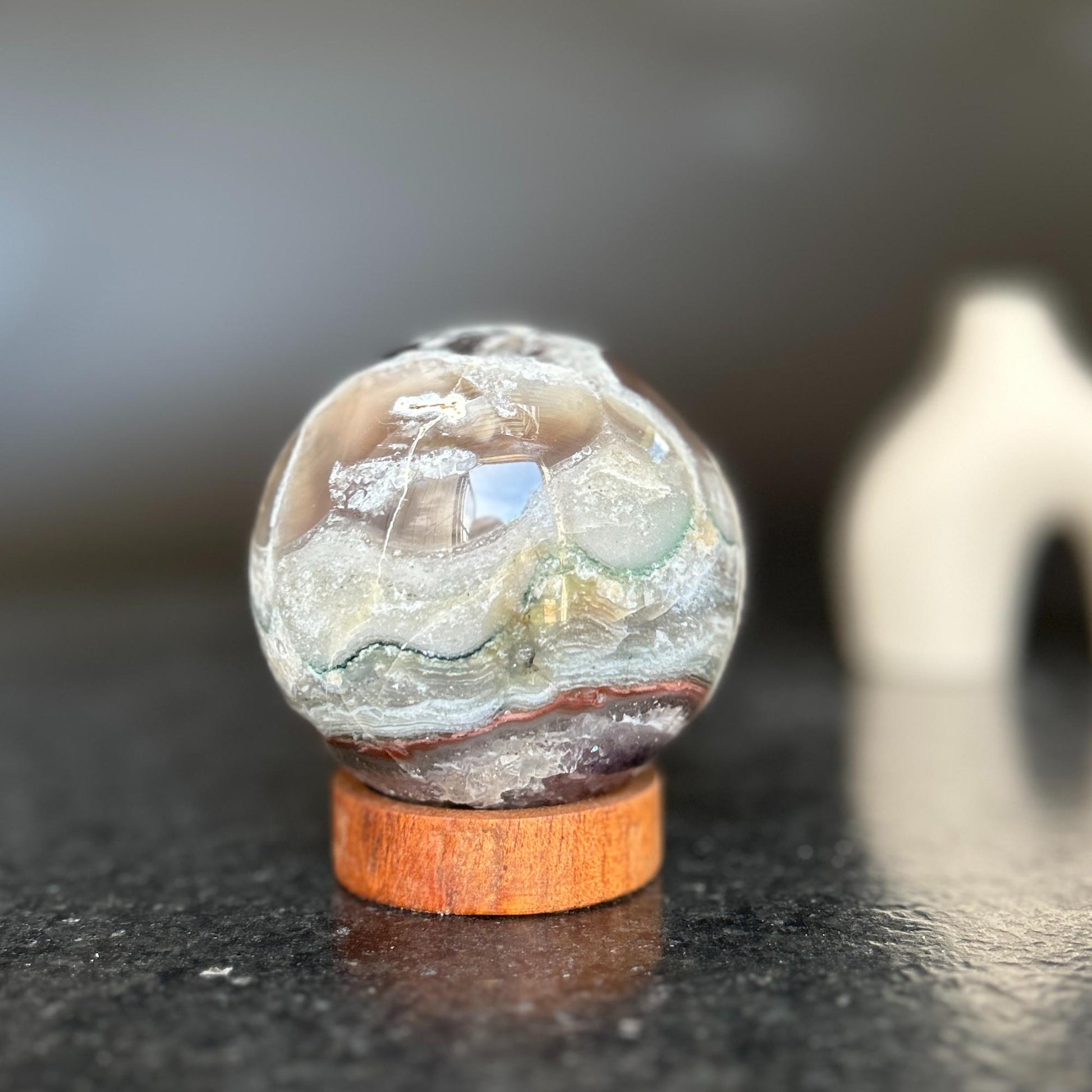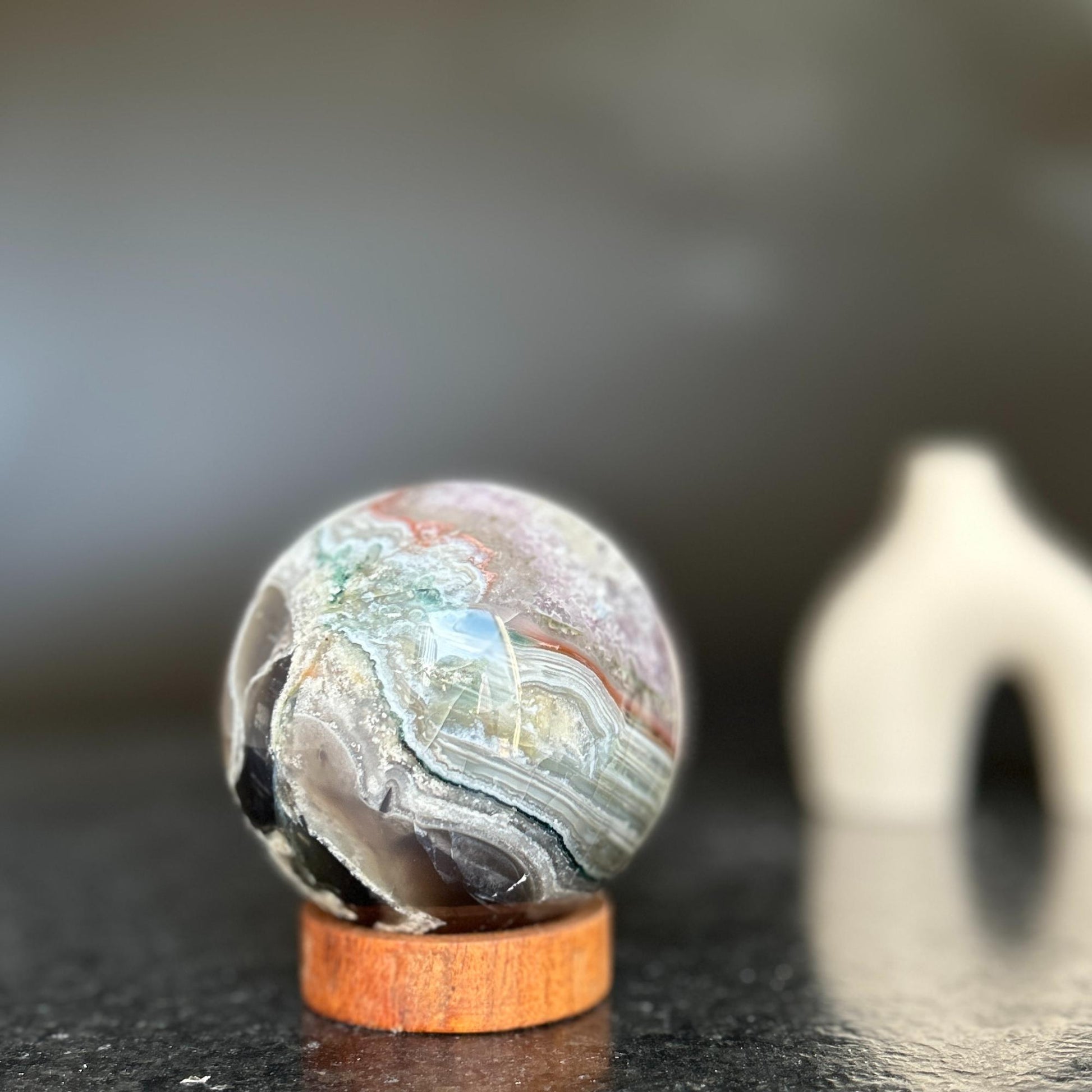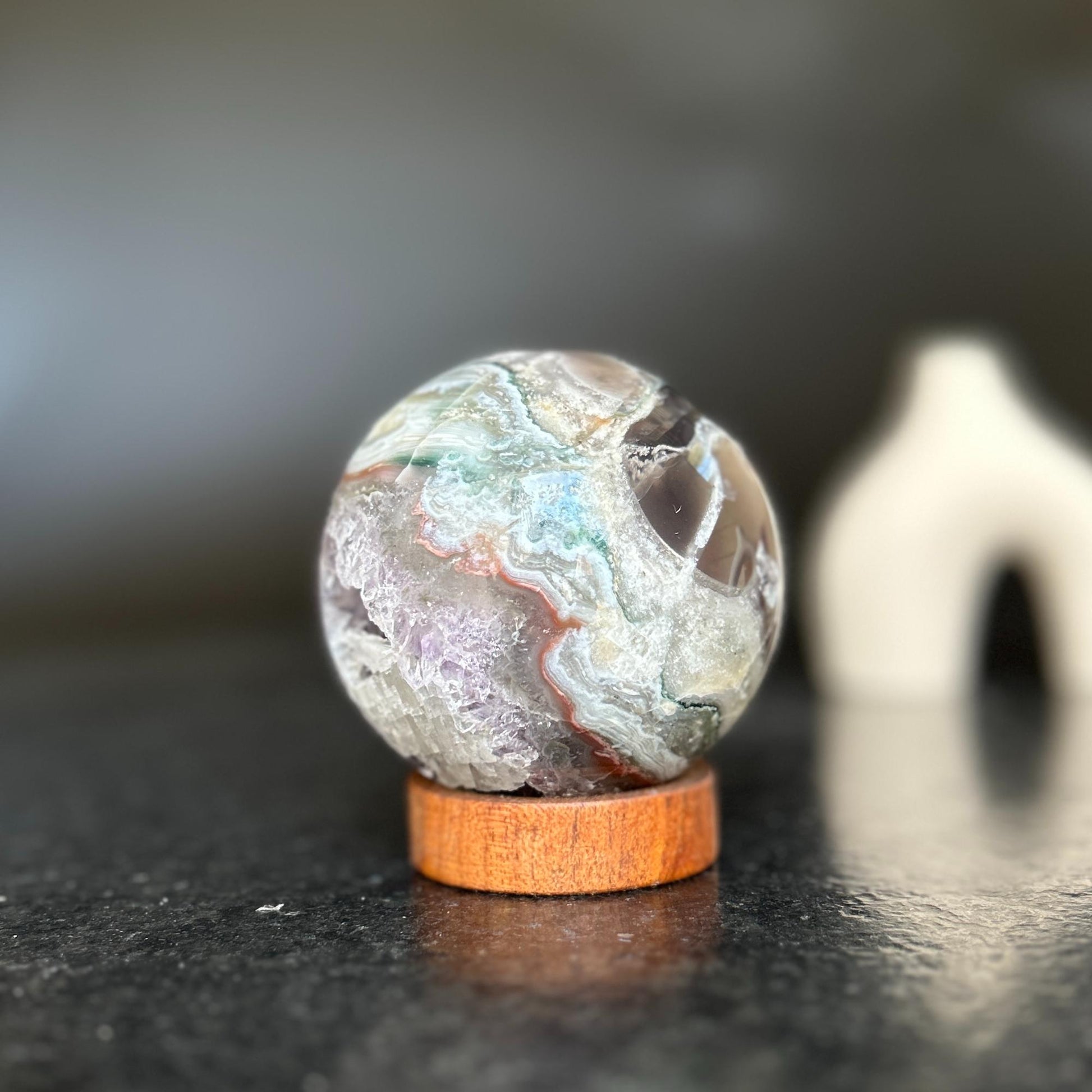 Carob wood base included. This piece of natural wood designed especially to hold the sphere completes a great product, making it more aesthetic and safe (protects it from falls).