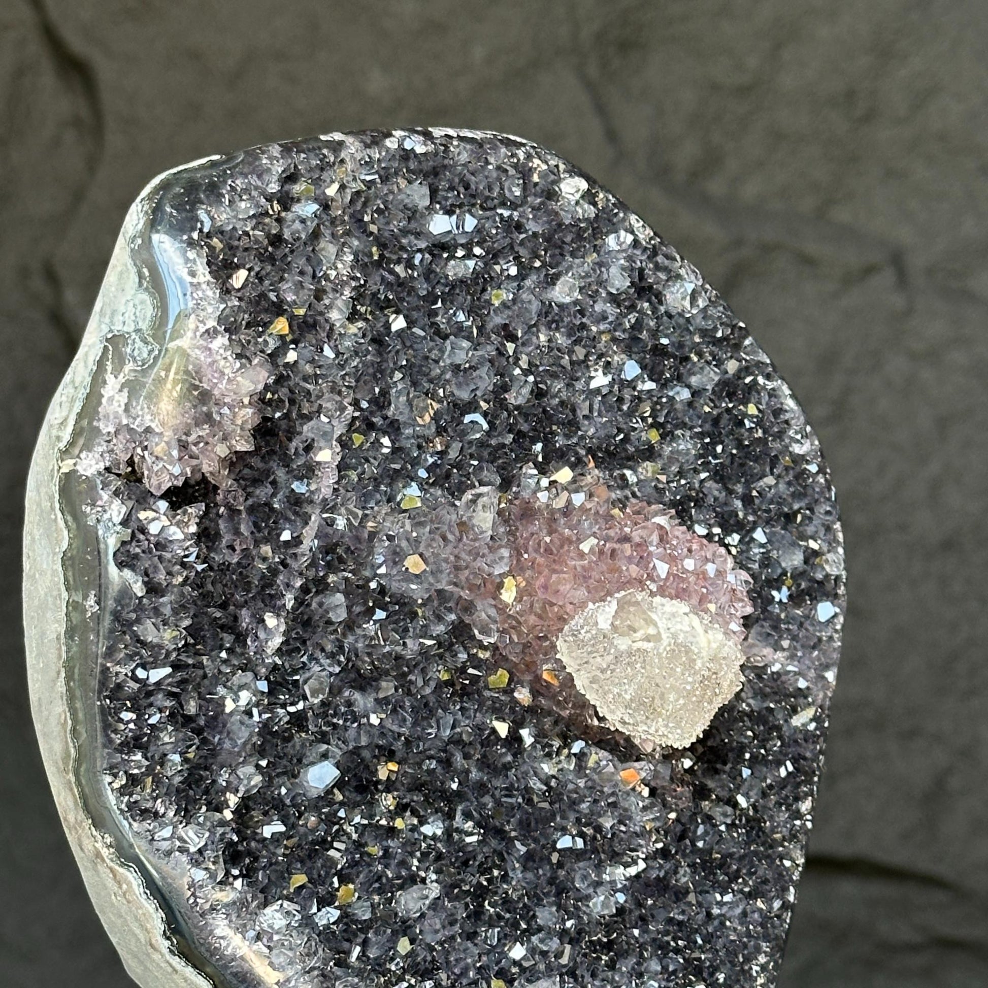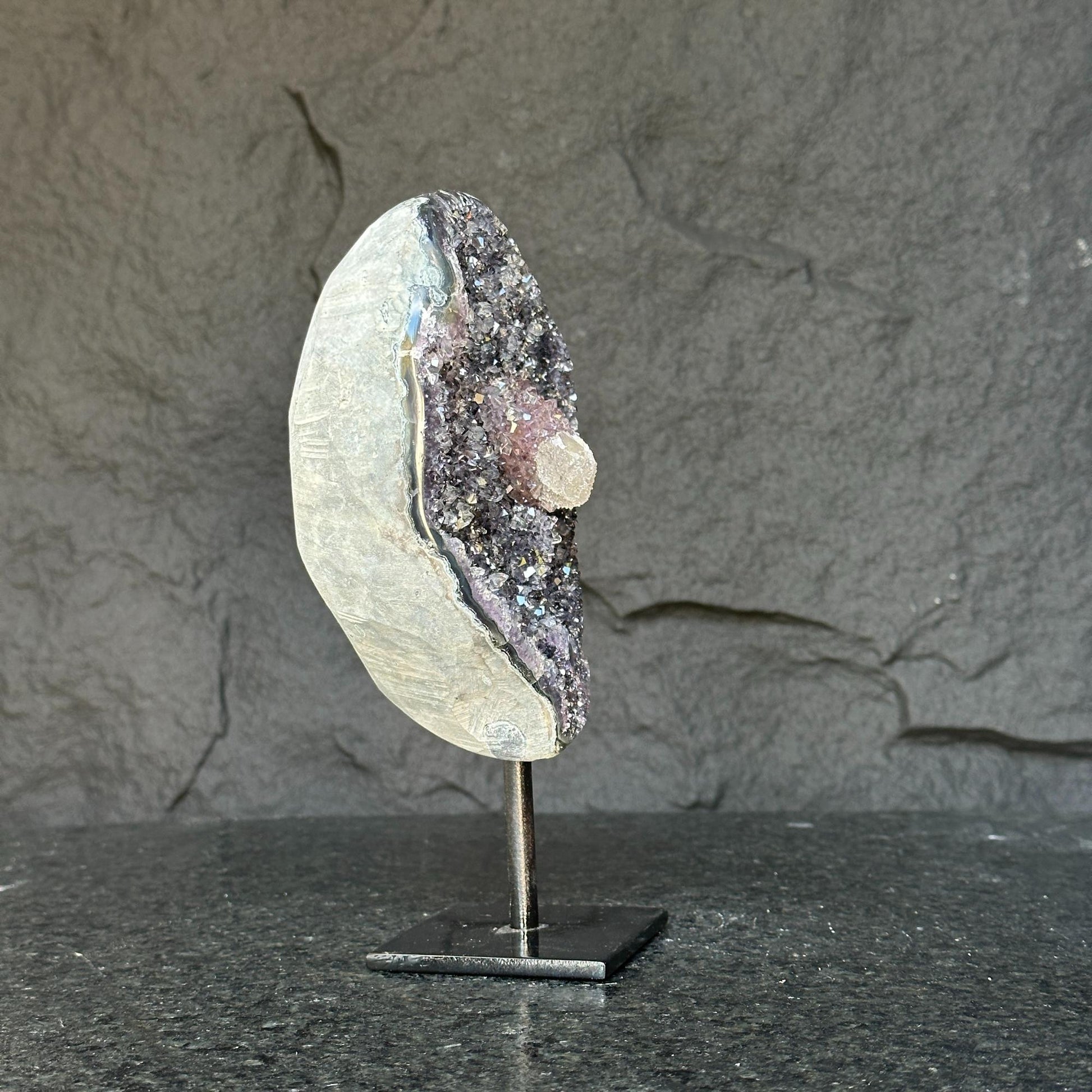 This amethyst with metal base included, has the highest quality of the semi precious stones. It has beautiful micro crystal formations in pink and white.