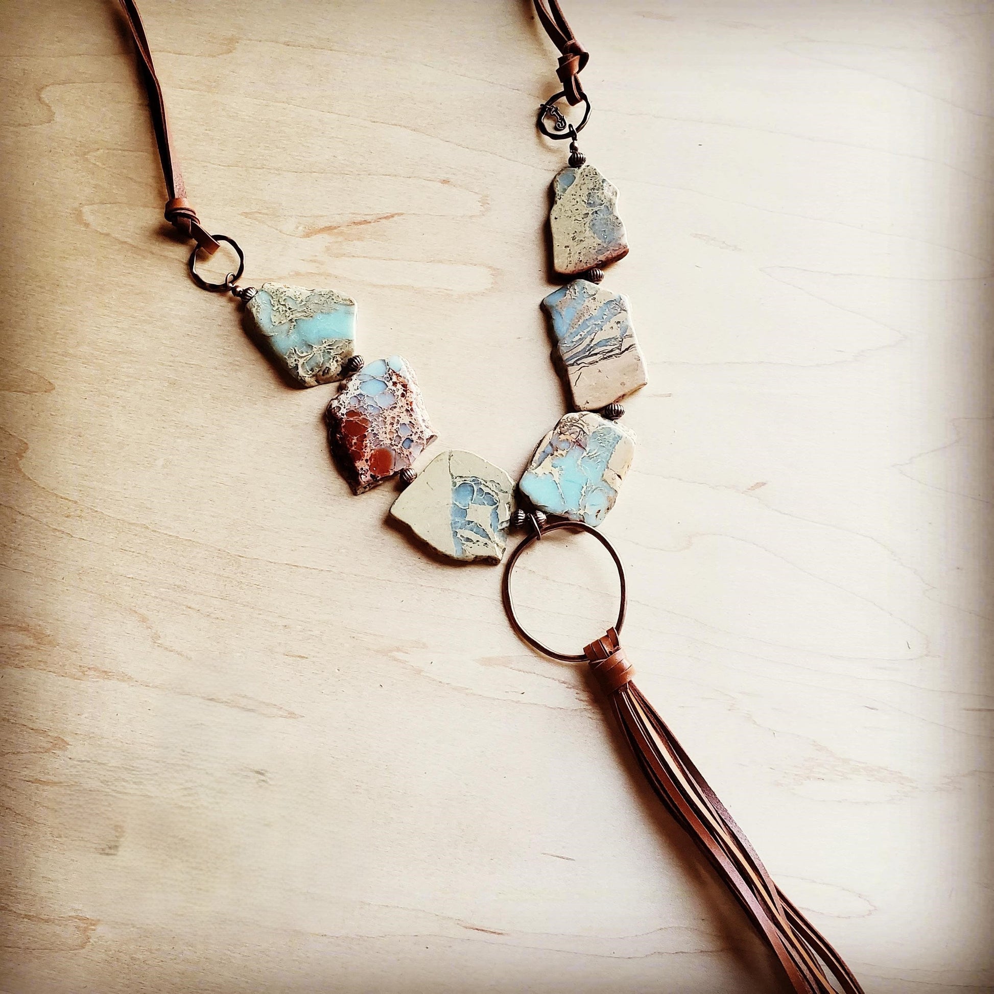 This Aqua Terra Slab Necklace is handcrafted by skilled artisans, making each piece unique. The boho design features a beautiful copper hoop and fringe tassel, adding a touch of elegance to any outfit. Enhance your style with this statement piece.