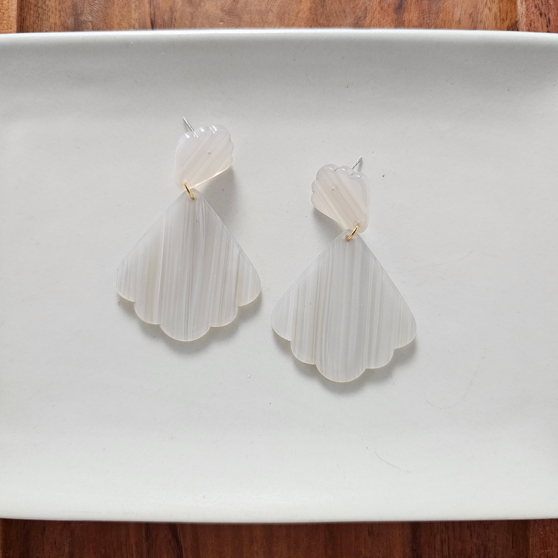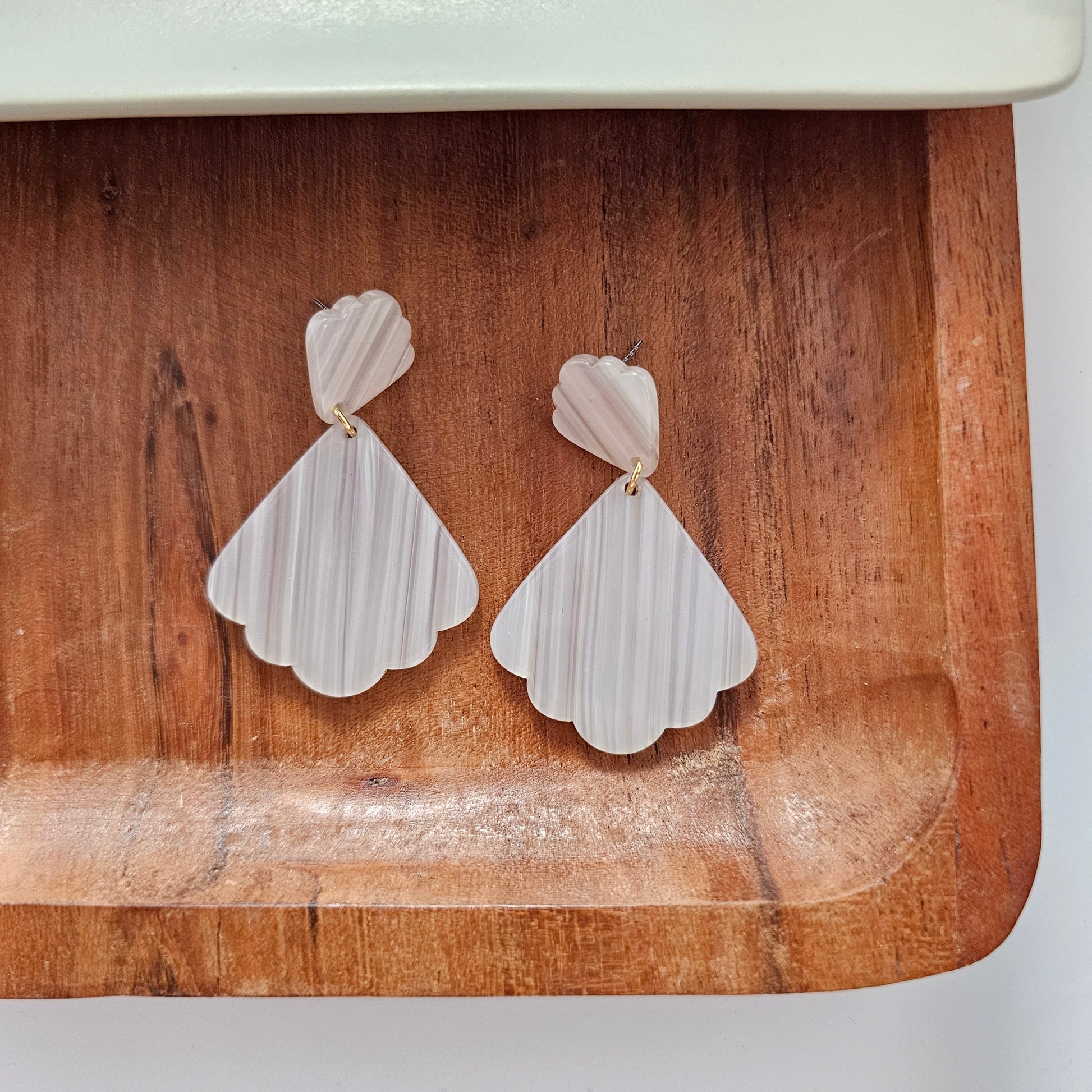 Make a splash with our Ariel earrings! Inspired by seashells, these scalloped acrylic earrings are a stunning addition to any outfit.. Perfect for a day at the beach or a night out on the town, these earrings are sure to catch some attention and make you feel 'spe-shell'. 🐚
