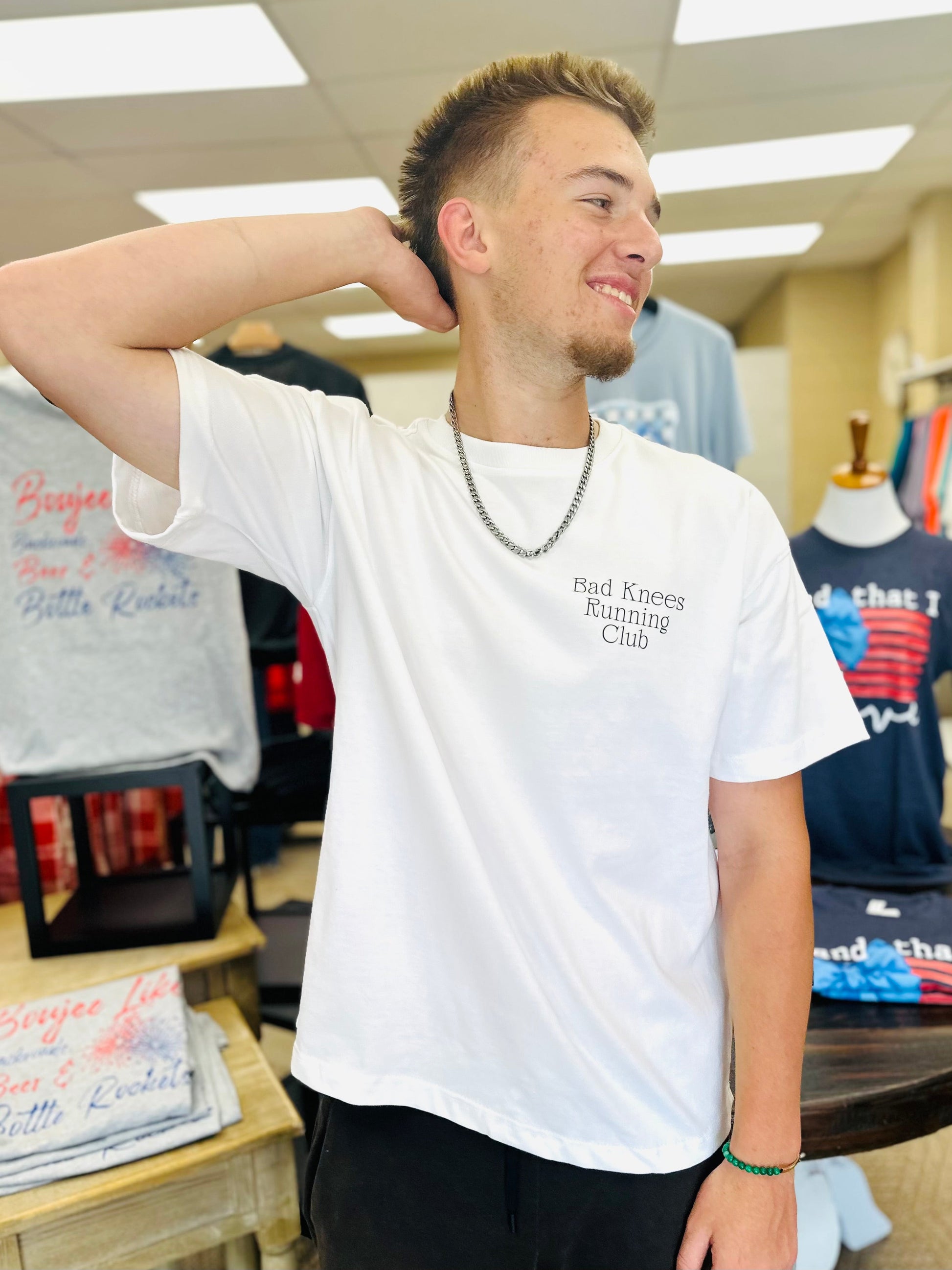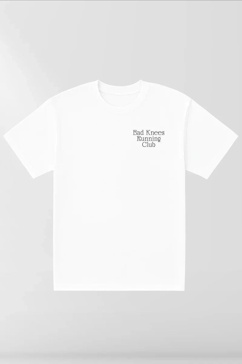 Bad Knees Running Club Still laced up. Still showing up. The "Bad Knees Running Club" tee is for the try-hards with tendonitis and the weekend warriors who stretch more than they run. Minimalist, witty, and weirdly motivational—this white 100% preshrunk cotton box tee gets it. You're not fast, but you're out there.