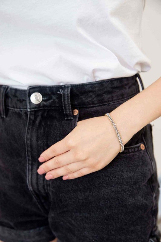 Go full glam with baguette stones and a gold plated tennis bracelet.