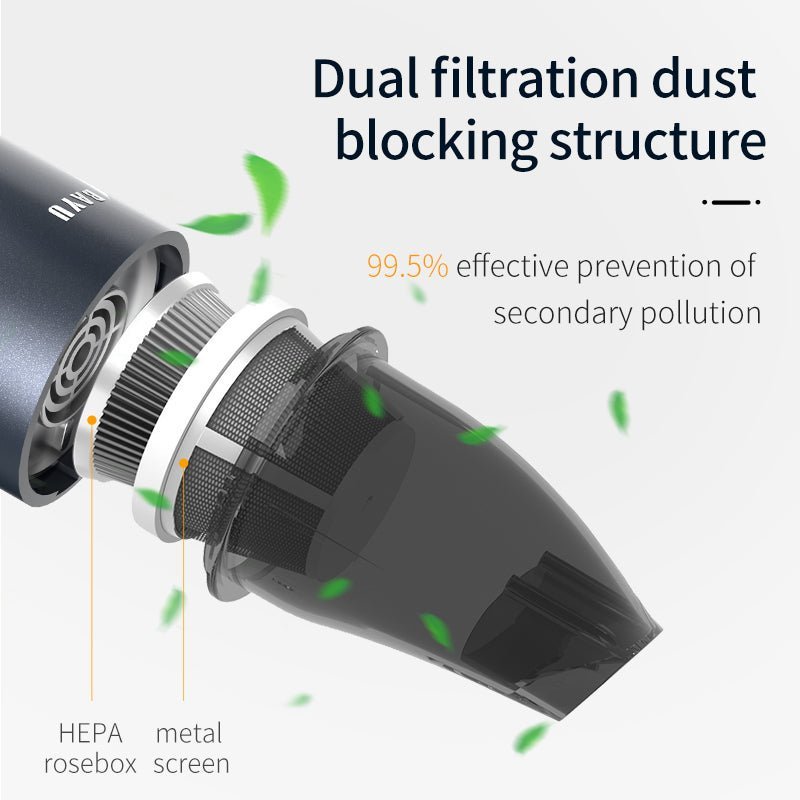 Built-in double-layer filter, the outer layer is a metal filter, and the inner layer is a HEPA filter.