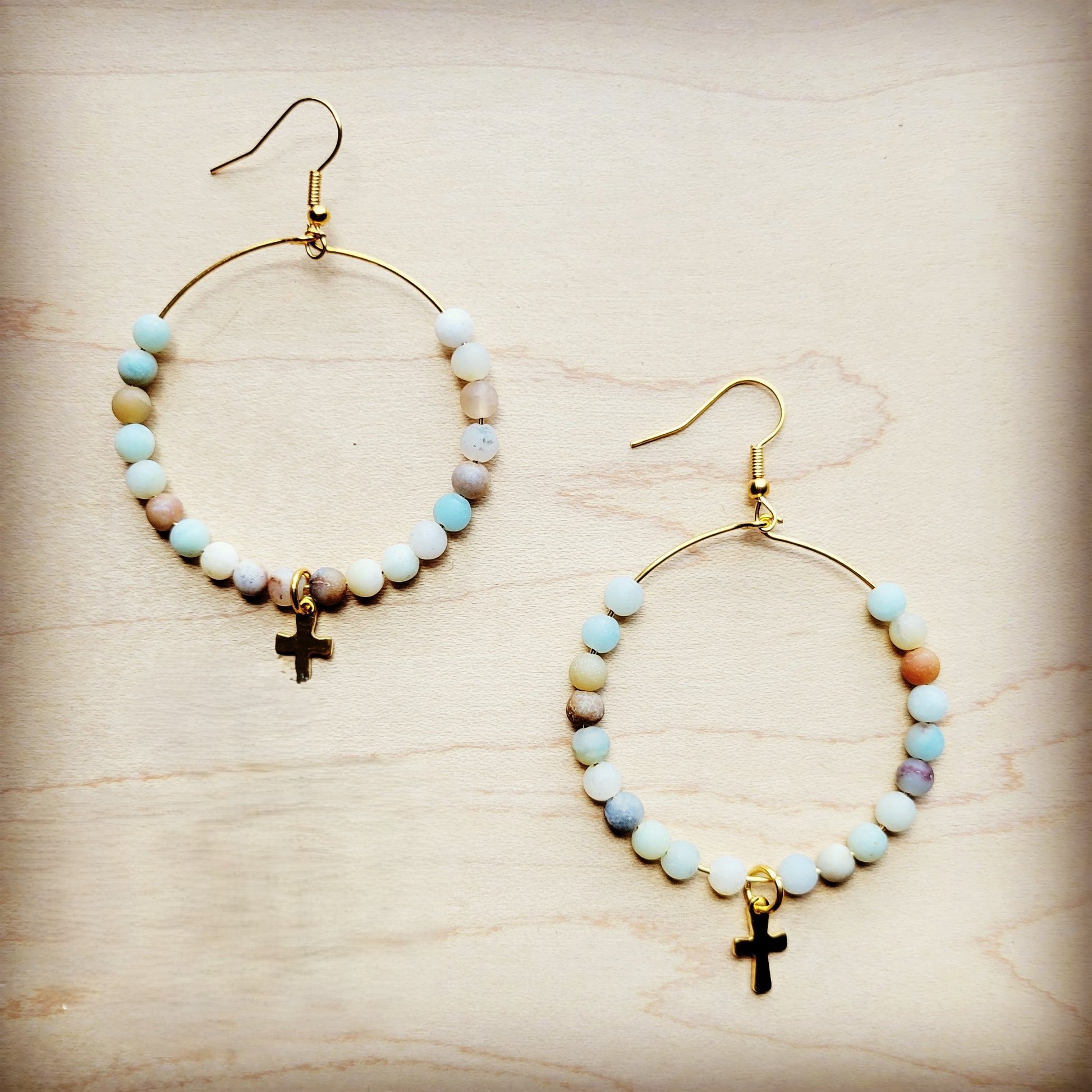 Upgrade your style with our elegant, handmade Beaded Hoop Earrings featuring unique Amazonite beads and a delicate Cross dangle. Perfect for adding a touch of boho to any outfit! Beaded Hoop Dangle Earrings are the perfect complement to your boho style! Featuring genuine gemstone beading. Wear with the matching necklaces shown in the photo.