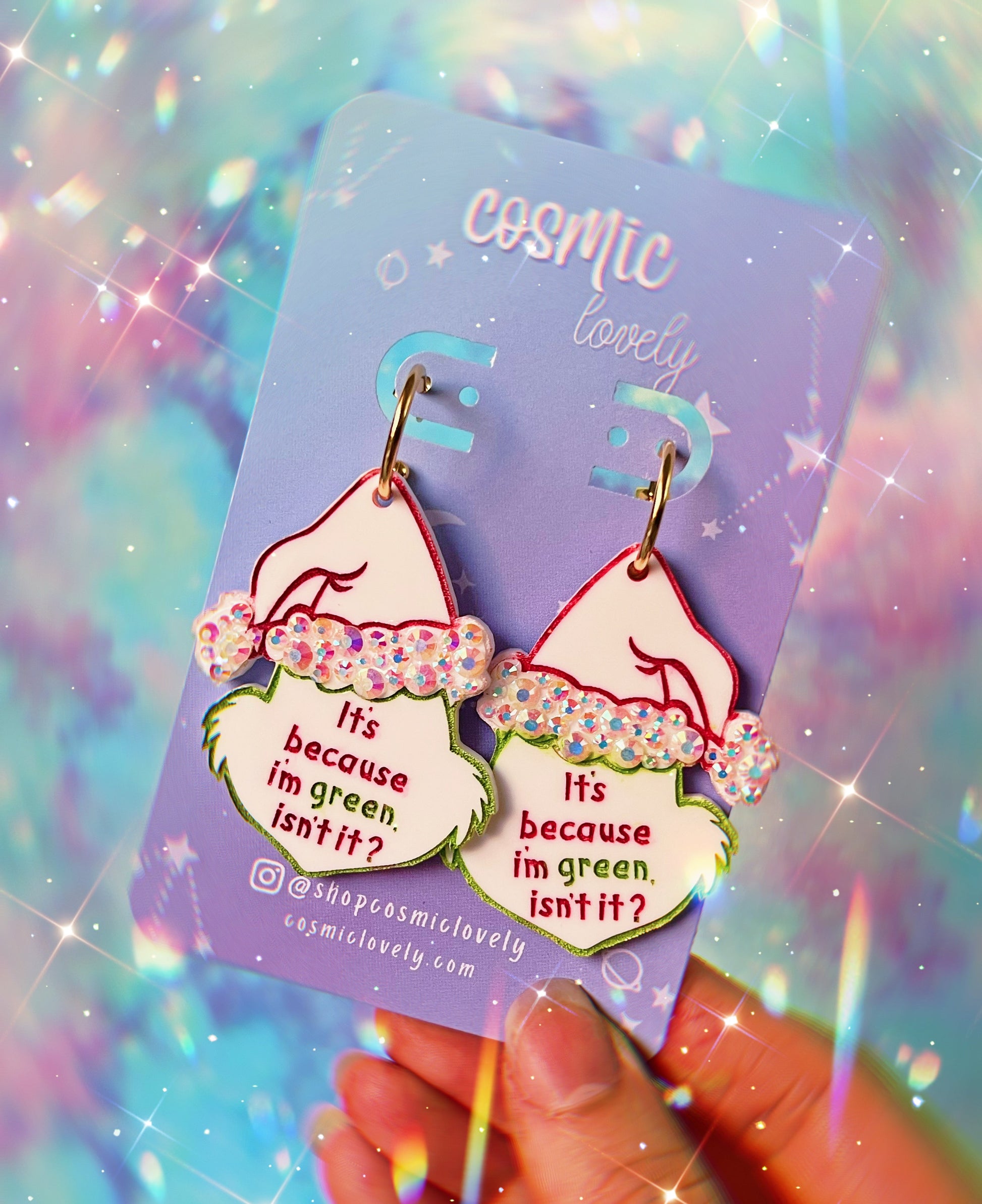 This listing is for ONE Pair of Because im Green Earrings. Hoops are hypoallergenic. If you wish to replace with hooks or lever backs please leave me a note at checkout. Earrings are approximately 2"