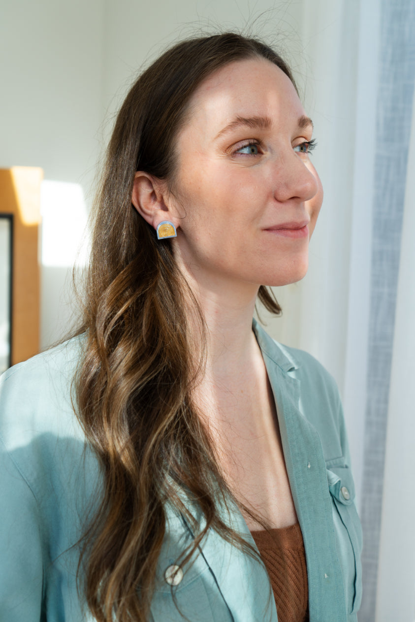 Get ready to dazzle with our Betty Studs! These Art Deco inspired acrylic stud earrings feature sleek gold arch accents for a touch of elegance. Lightweight yet striking, they are perfect for adding a vintage-inspired charm to your everyday outfits.