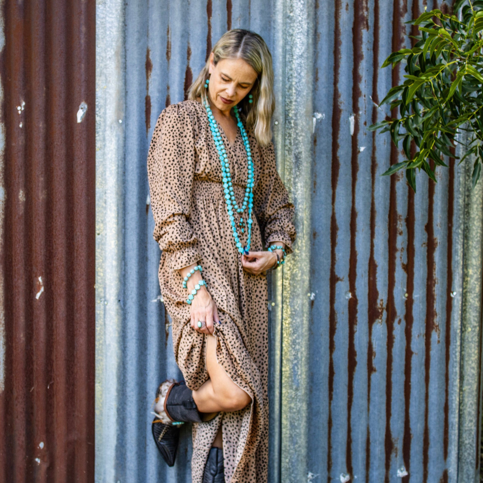 This turquoise stone necklace is the perfect item to layer with shorter necklaces and boho statement necklaces