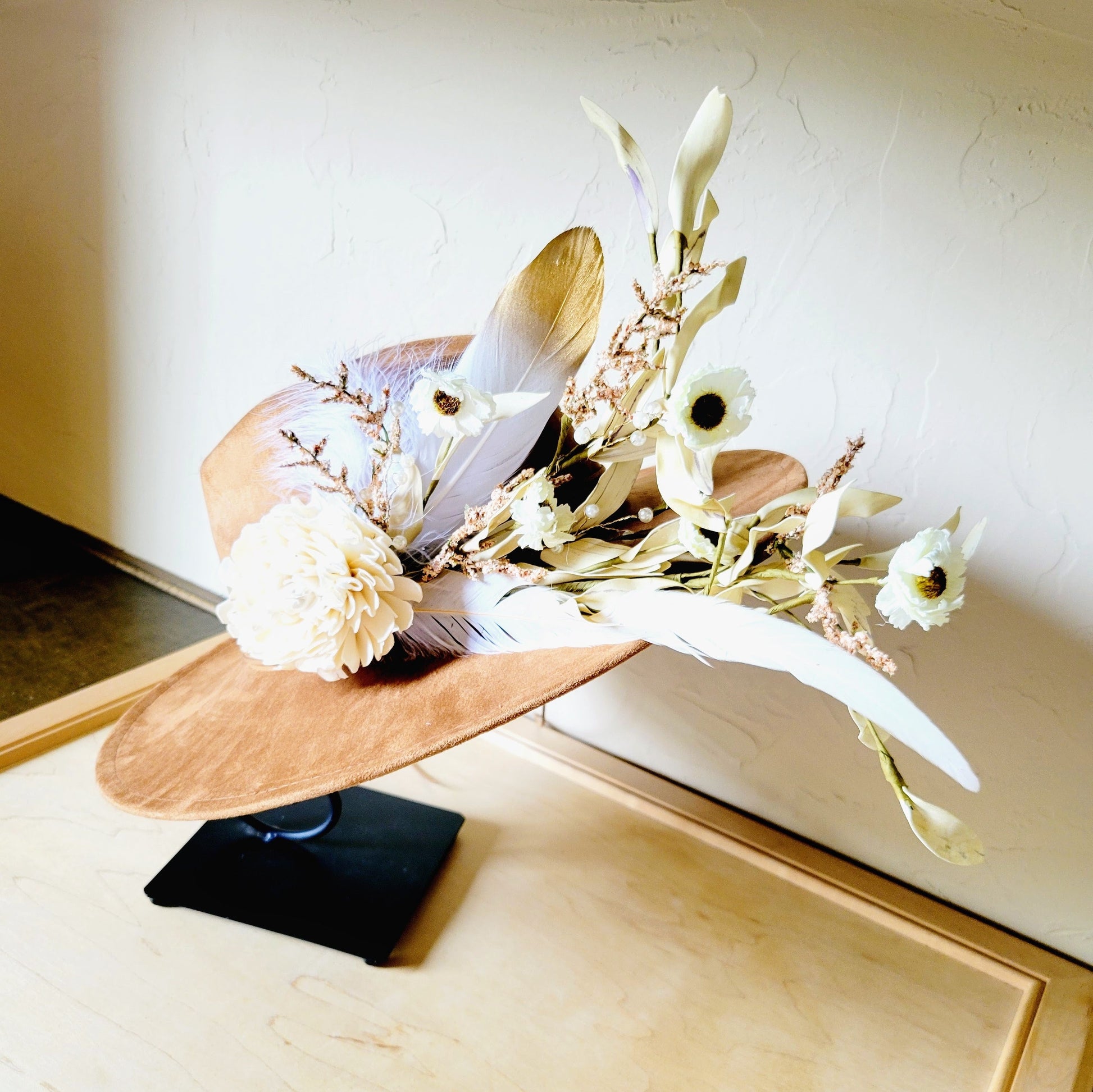 Elevate your boho western wedding with our bridal hat in bone. This desert wedding inspired hat features neutral tones and a touch of blush pink. Our boho hat, adorned with cream roses, ivory daisys, gold and white feathers, and additional floral picks. This pairs beautifully with pearls from our wedding collection. Create an intimate and elegant boho western look for your special day! The item that you receive in the mail will resemble the one in the picture but, because every piece by Jewelry Junkie is handmade, it will not be identical.