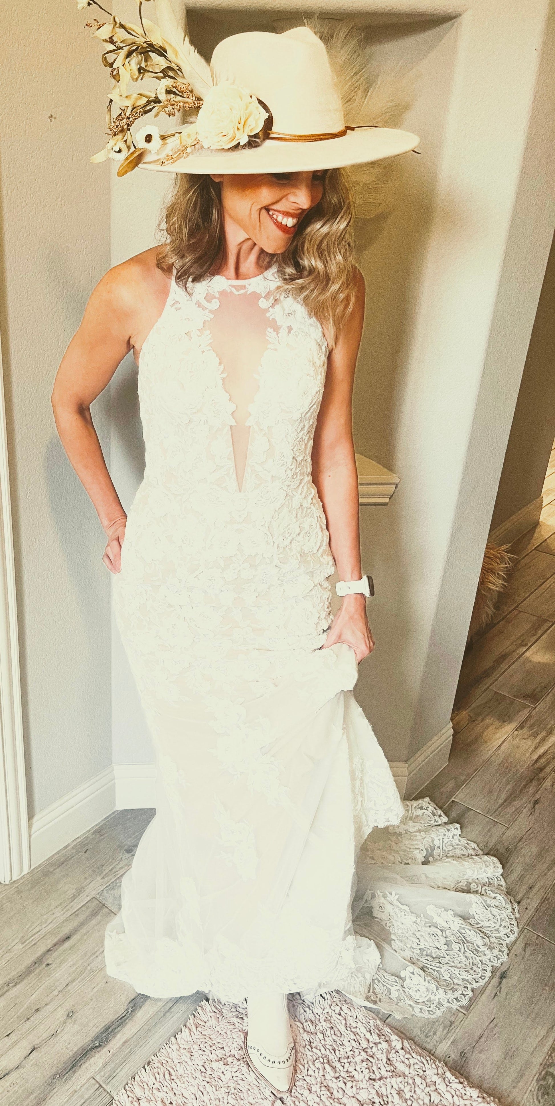 Elevate your boho western wedding with our bridal hat collection. This desert wedding inspired hat features neutral tones and a touch of blush pink.  Our boho hat is adorned with cream roses, ivory daisys, white feathers, and additional floral picks.  This pairs beautifully with pearls from our wedding collection and the larger bridal hat. Create an intimate and elegant boho western look for your special day!  The item that you receive in the mail will resemble the one in the picture but, because every piece by Jewelry Junkie is handmade, it will not be identical.