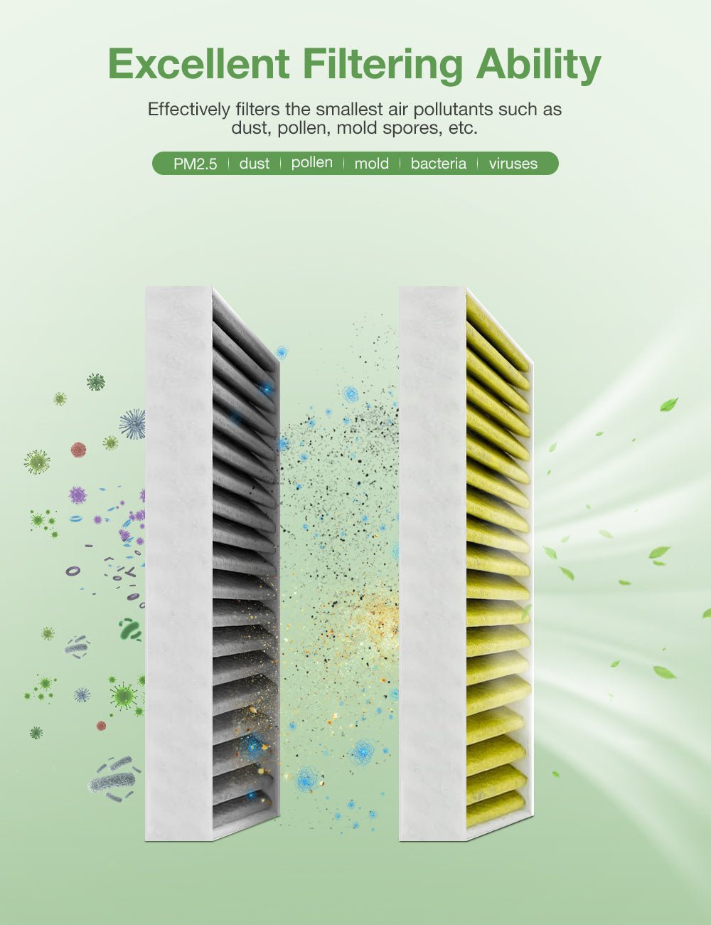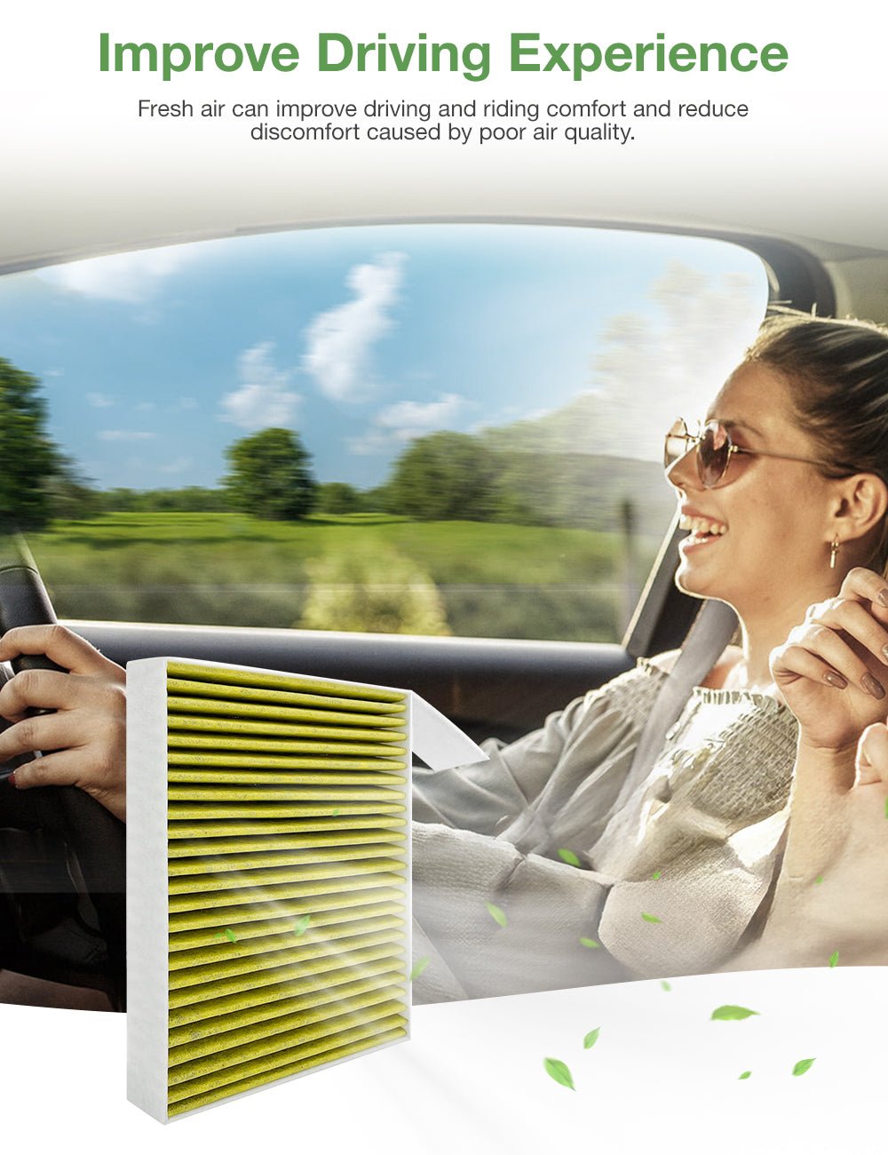 ă HIGH-QUALITY AIR FILTERăMade of high-quality materials (PM2.5 Activated cabin air filter), more breathable than other materials to enhance HVAC performance, and the filtering effect is better. It is sturdy and reliable, not easy to bend and deform, and to increase its long lifespan.