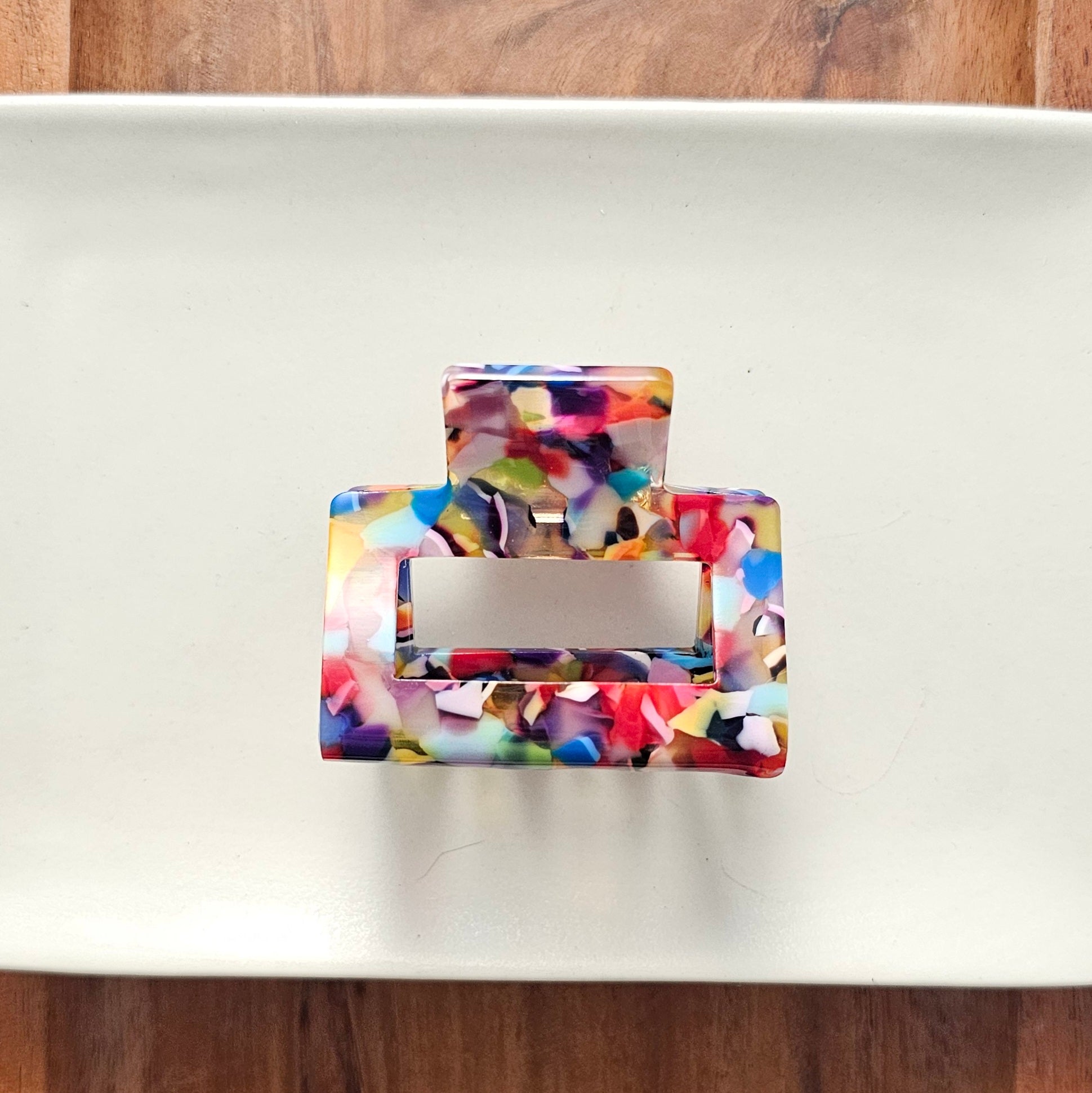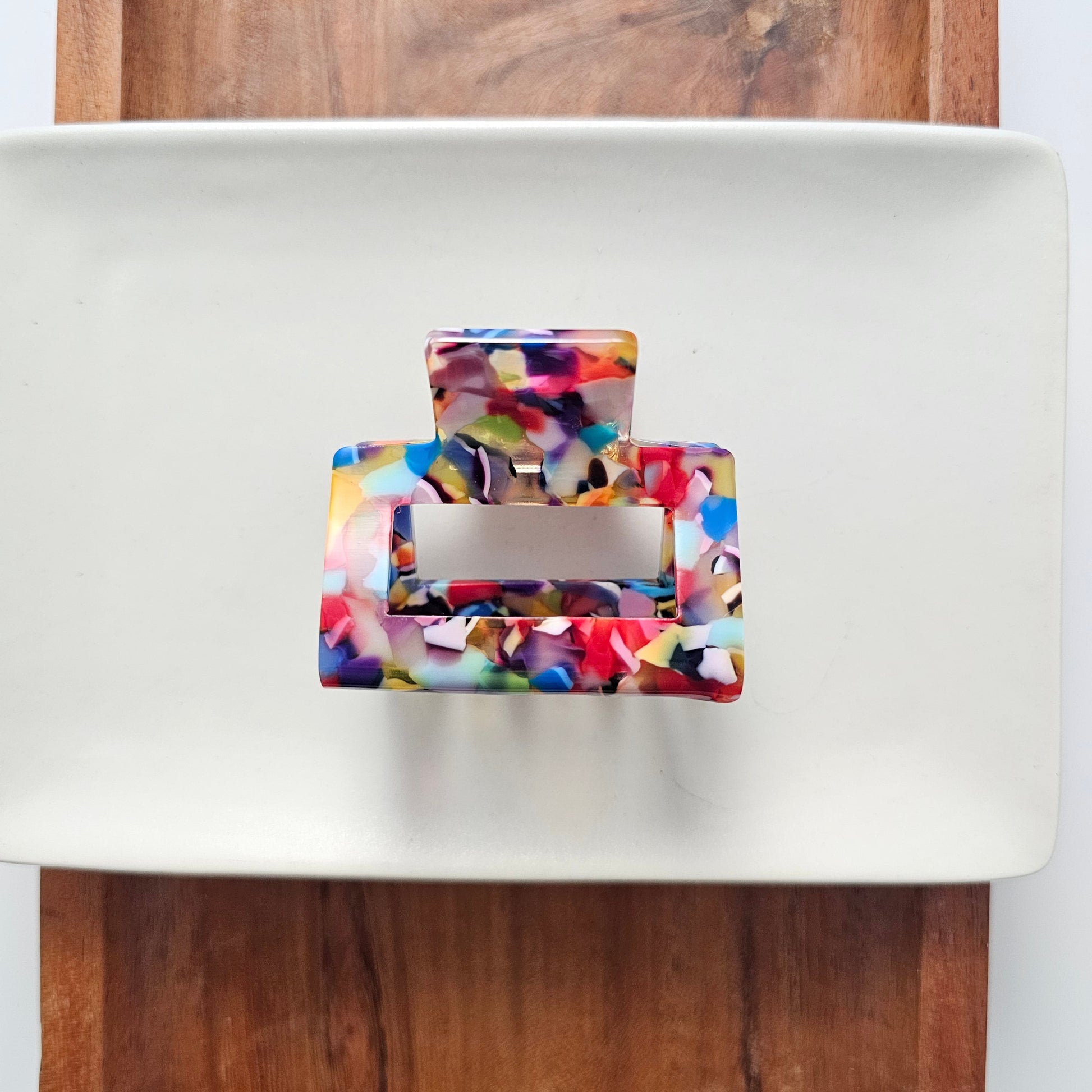 • Plant-based acetate acrylic hair claw with a clear protective cover over the spring.