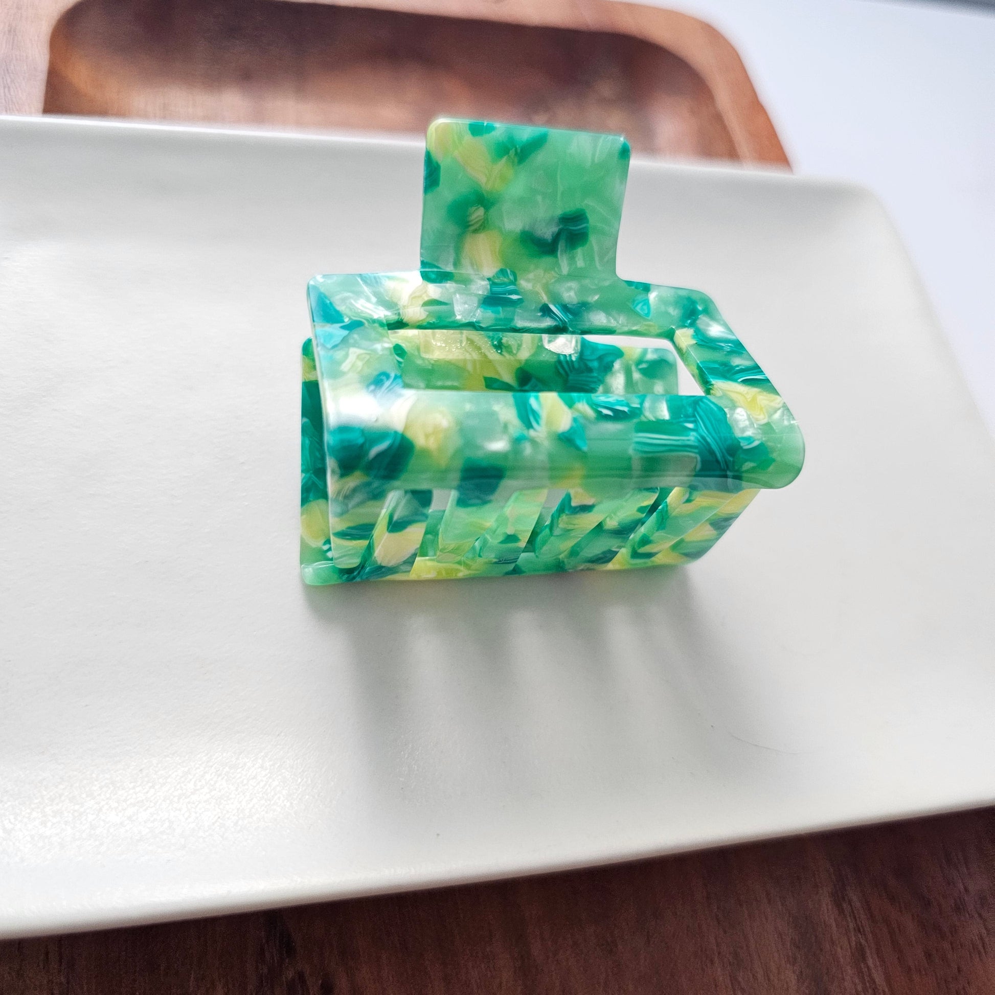 • Plant-based acetate acrylic hair claw with a clear protective cover over the spring.
