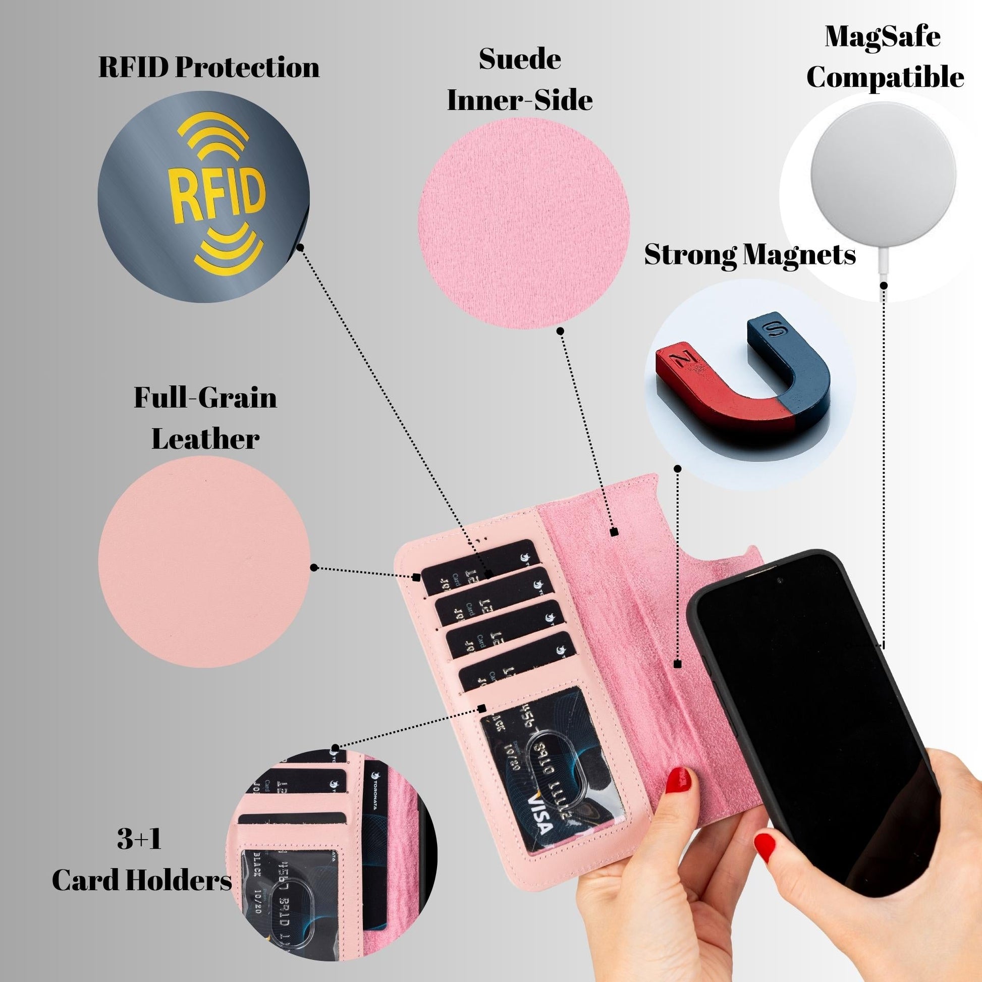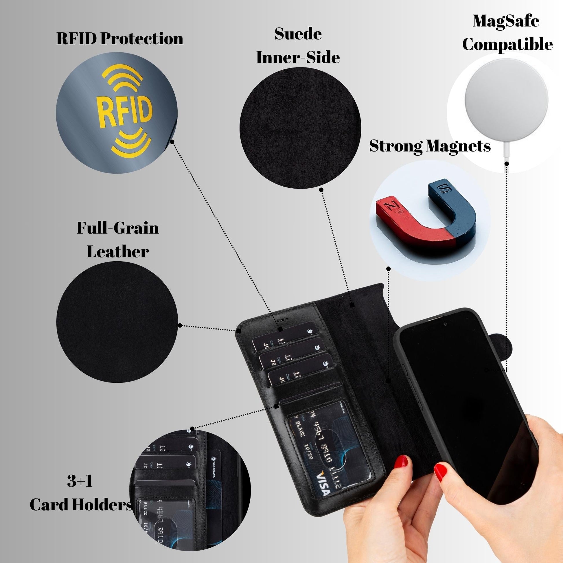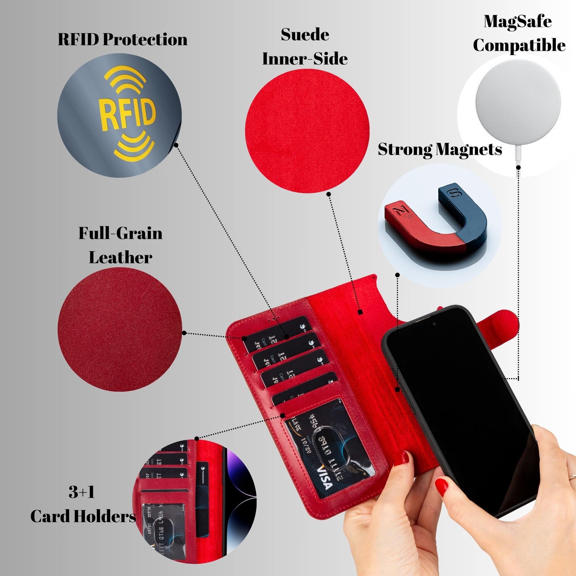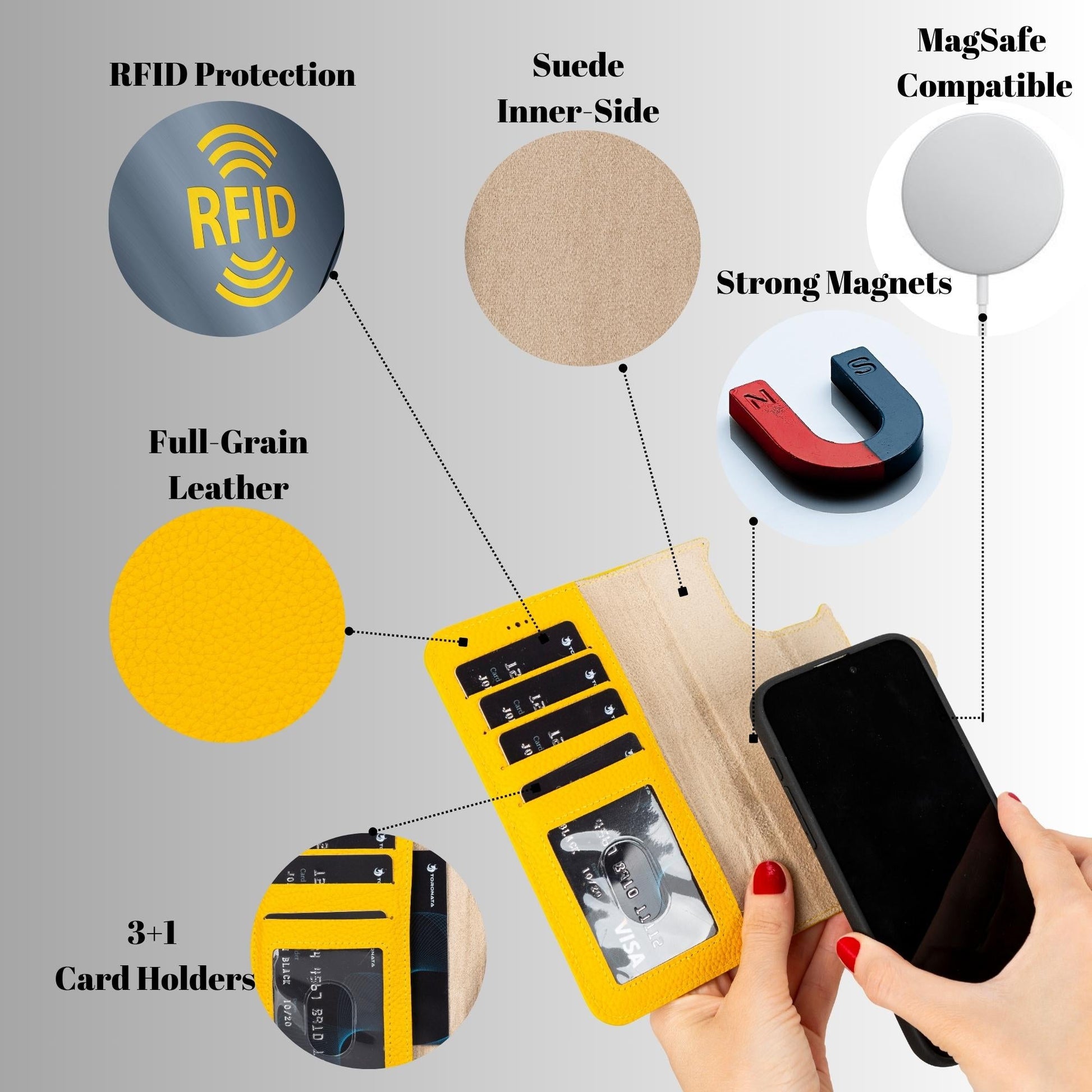 Experience the ultimate in protection and style with the Casper Wallet. Handmade from genuine leather and designed with four credit card slots and a cash compartment, its MagSafe and wireless charging-compatible back cover and strong magnets keep your iPhone 15 Pro Max, iPhone 15 Pro, iPhone 15 Plus, and iPhone 15 secure. RFID protection guards against card skimming, while the transparent window and pushable structure give easy access to an ID. Plus, its kickstand feature makes watching videos a breeze. Get the Toronata Casper Wallet today!