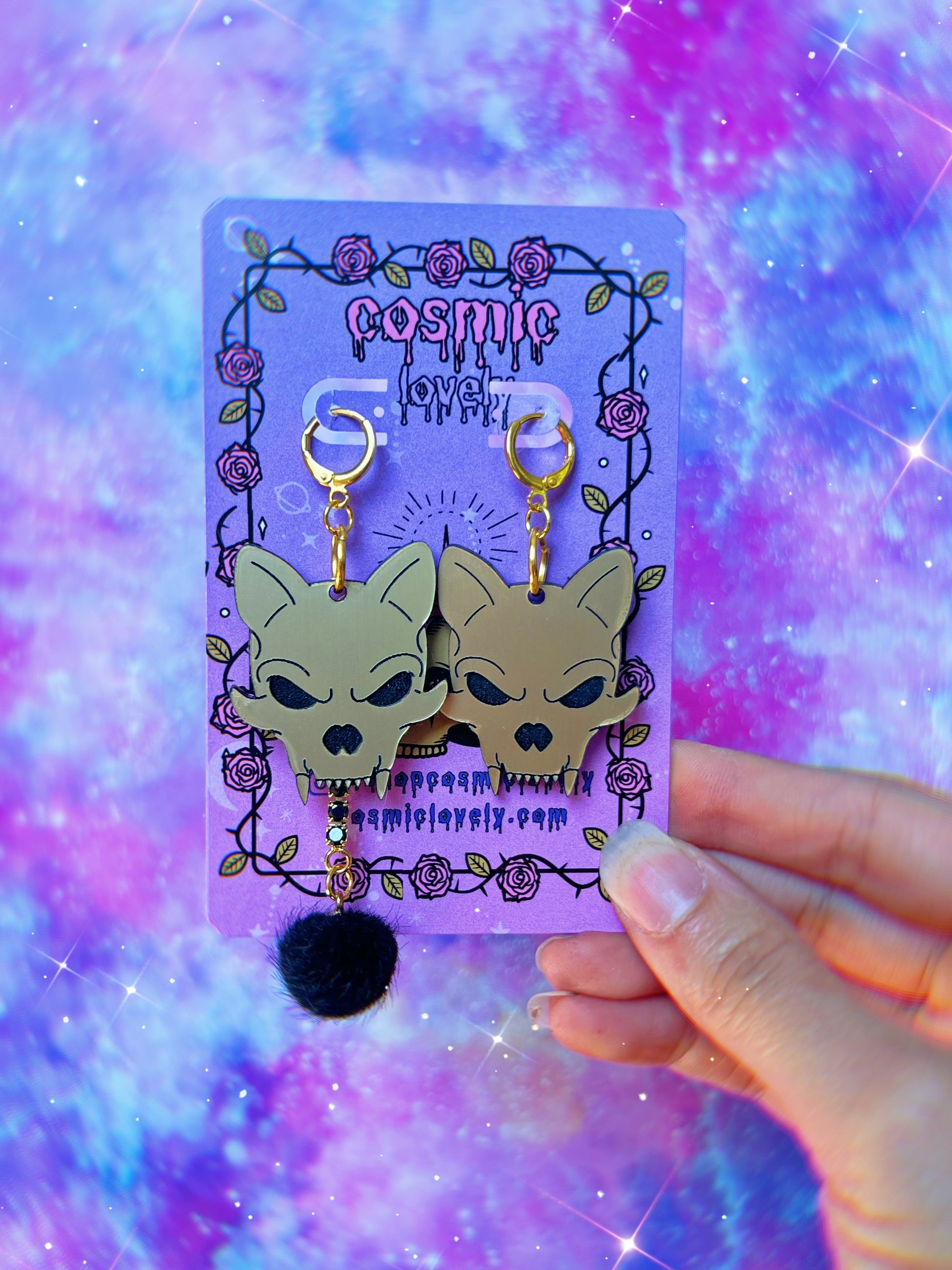 This listing is for ONE pair of Cat Skull Earrings. Hoops are hypoallergenic. Available with or without pompoms and rhinestones. Earrings are approximately 1.75- 2.5"in"