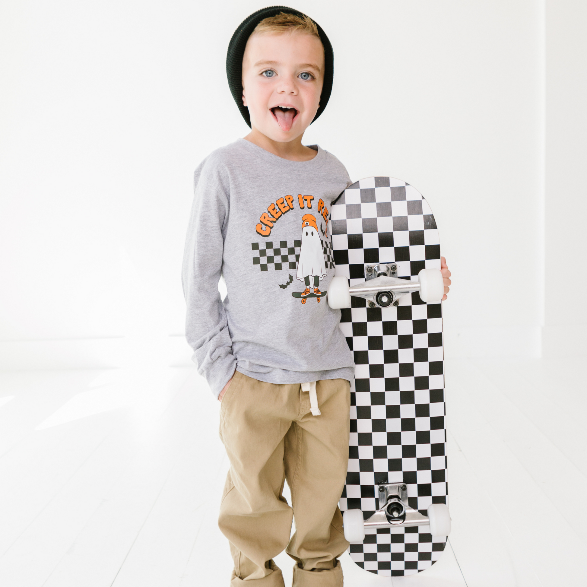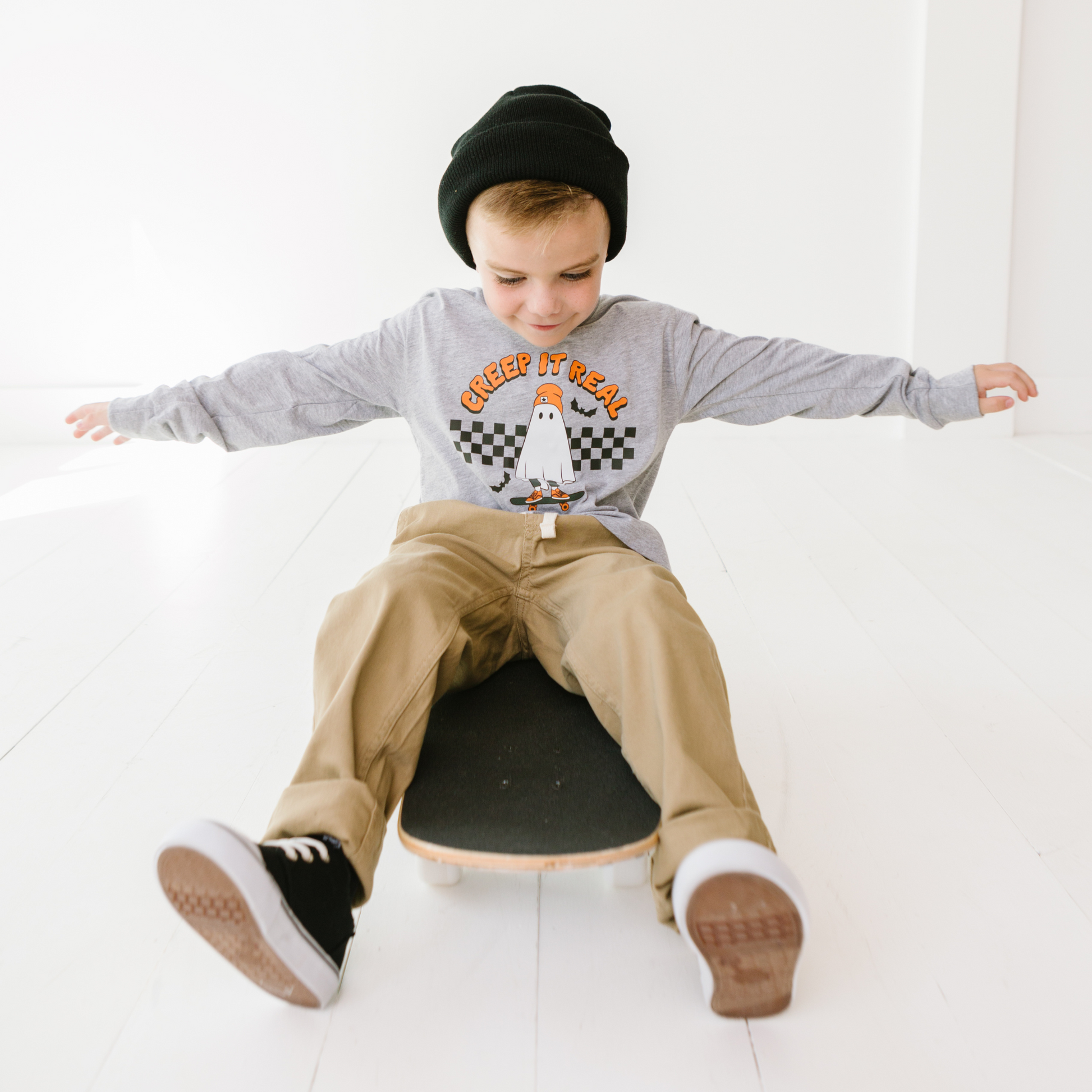 Creep it Real! Features & Sizing*Crewneck, pullover styling*Long Sleeve*Grey*Print as shown in picturesMaterials & Care*Soft Feel *90/10 airlume combed and ringspun cotton/polyester