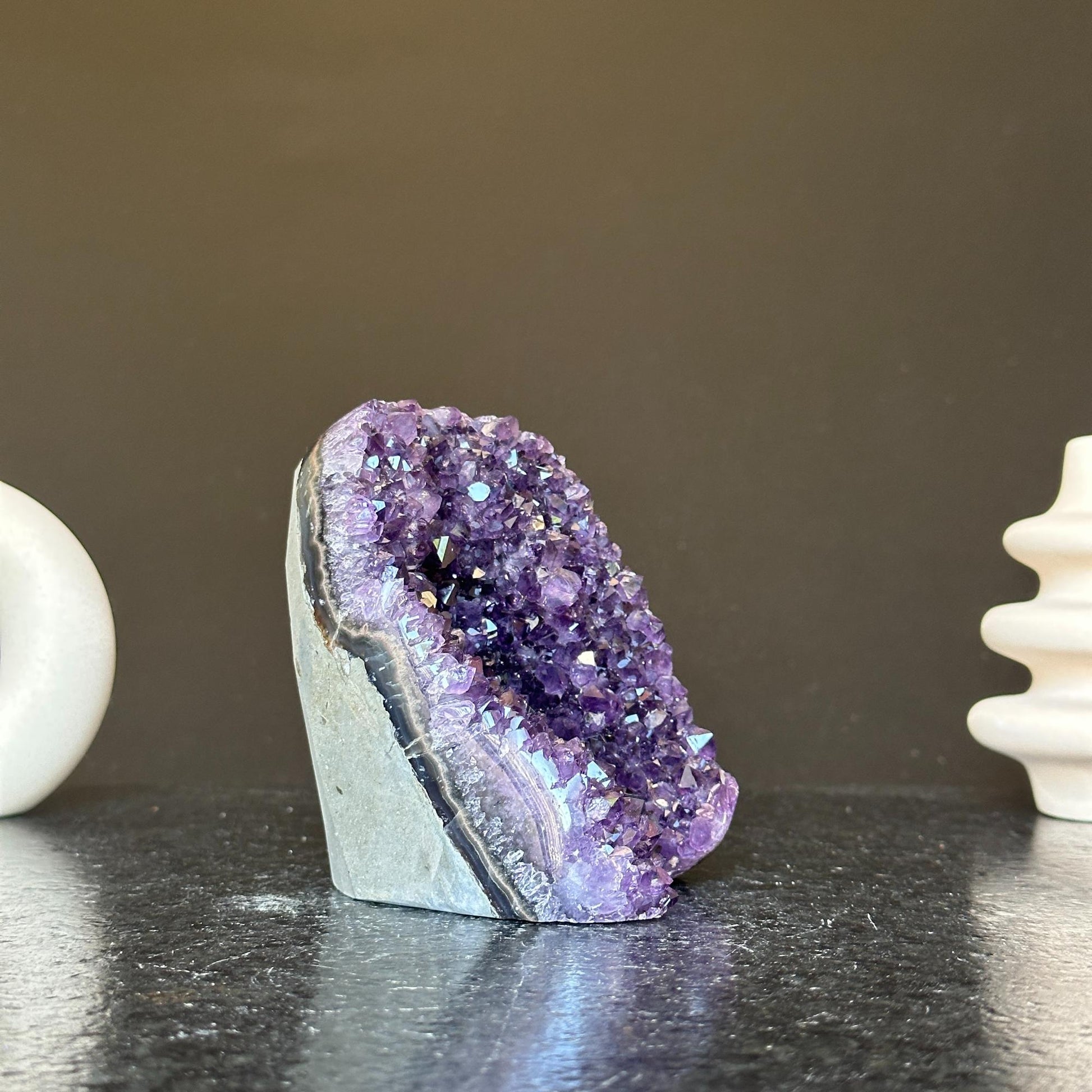 This deep purple amethyst geode has the highest quality of the semi precious stones. It's a cathedral shaped crystal, self stand, so it's perfect to decor your room or office.