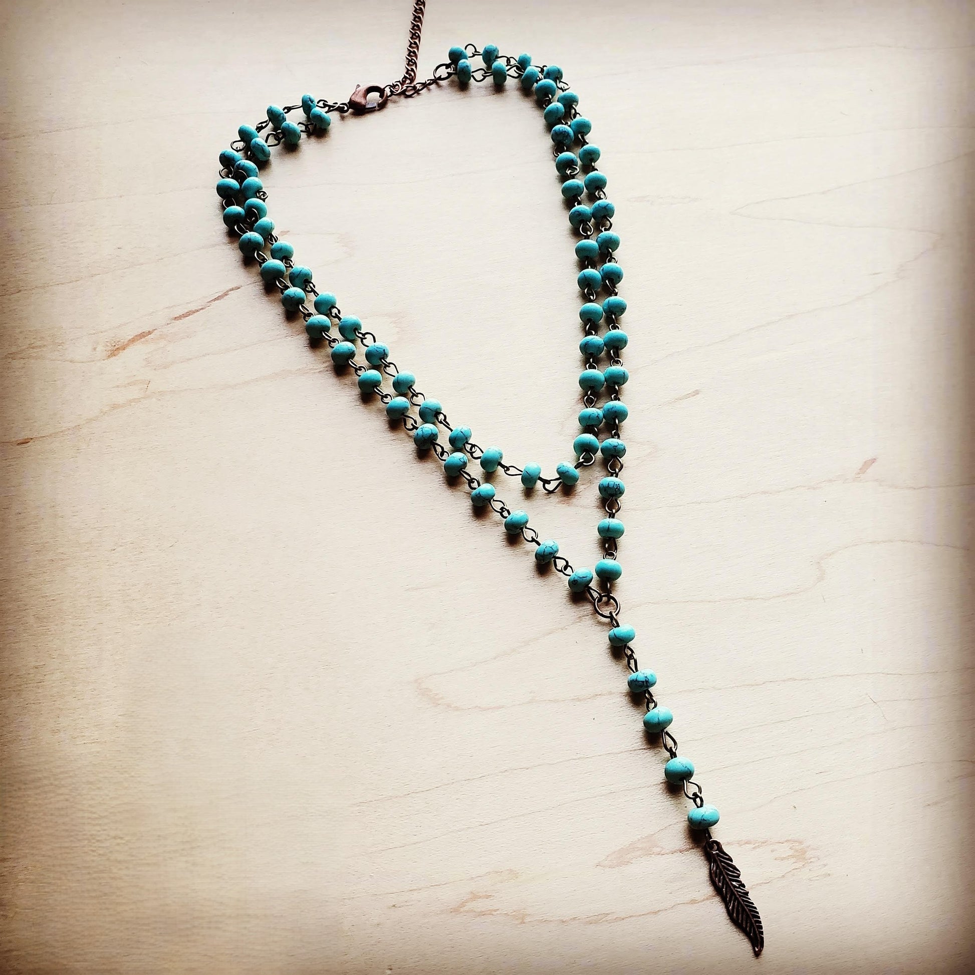 This double lariat necklace is a fantastic piece to add to your jewelry collection. The blue turquoise beads create a look that is as classic as it gets. With a copper feather pendant hanging from the bottom of the necklace, you have the perfect touch of boho chic. Choose to dress it up or wear it casually, either way, you are going to have a necklace that will take your outfit to the next level.