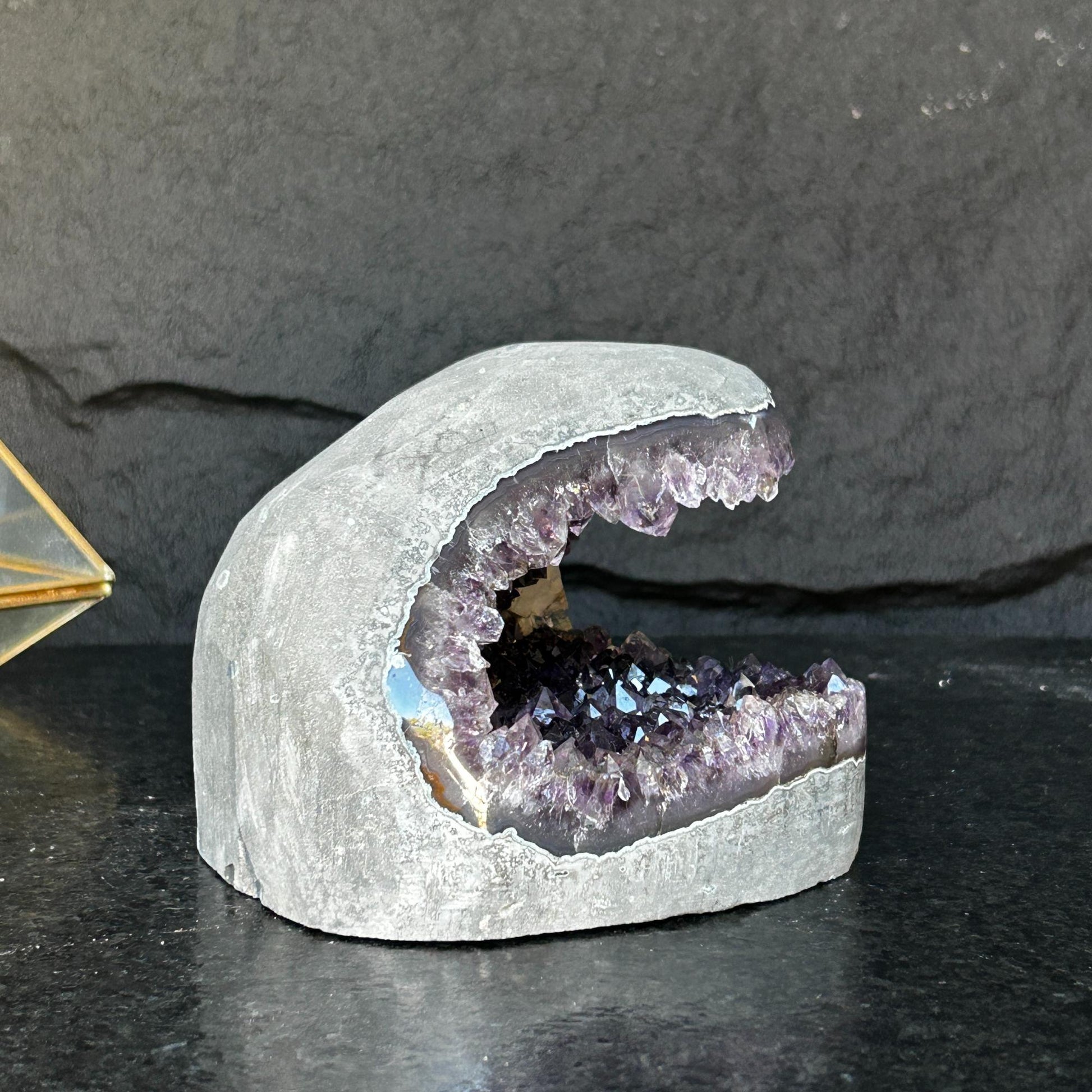 This natural amethyst geode has the highest quality of semi-precious stones. It's a flat amethyst crystal perfect to use a table centerpiece.
