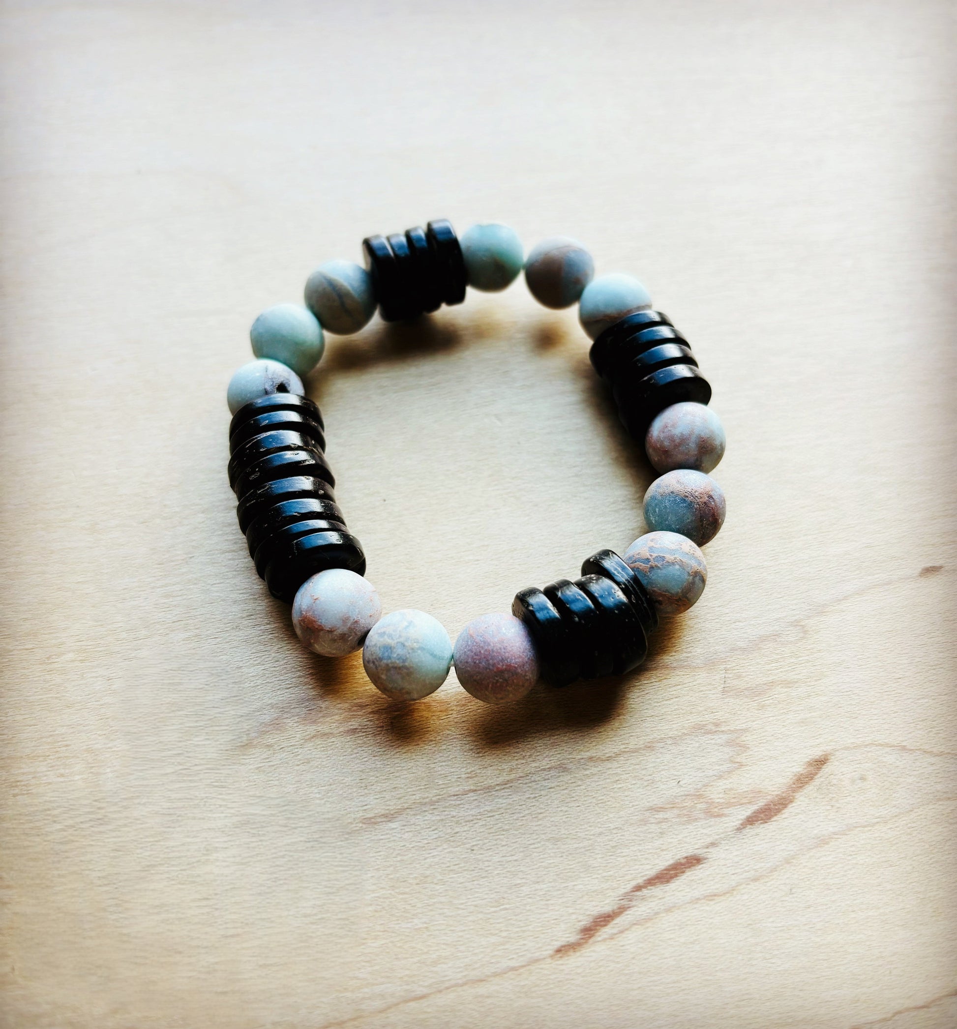 This handmade beaded bracelet features jasper and wooden beads, creating a unique, earthy look.