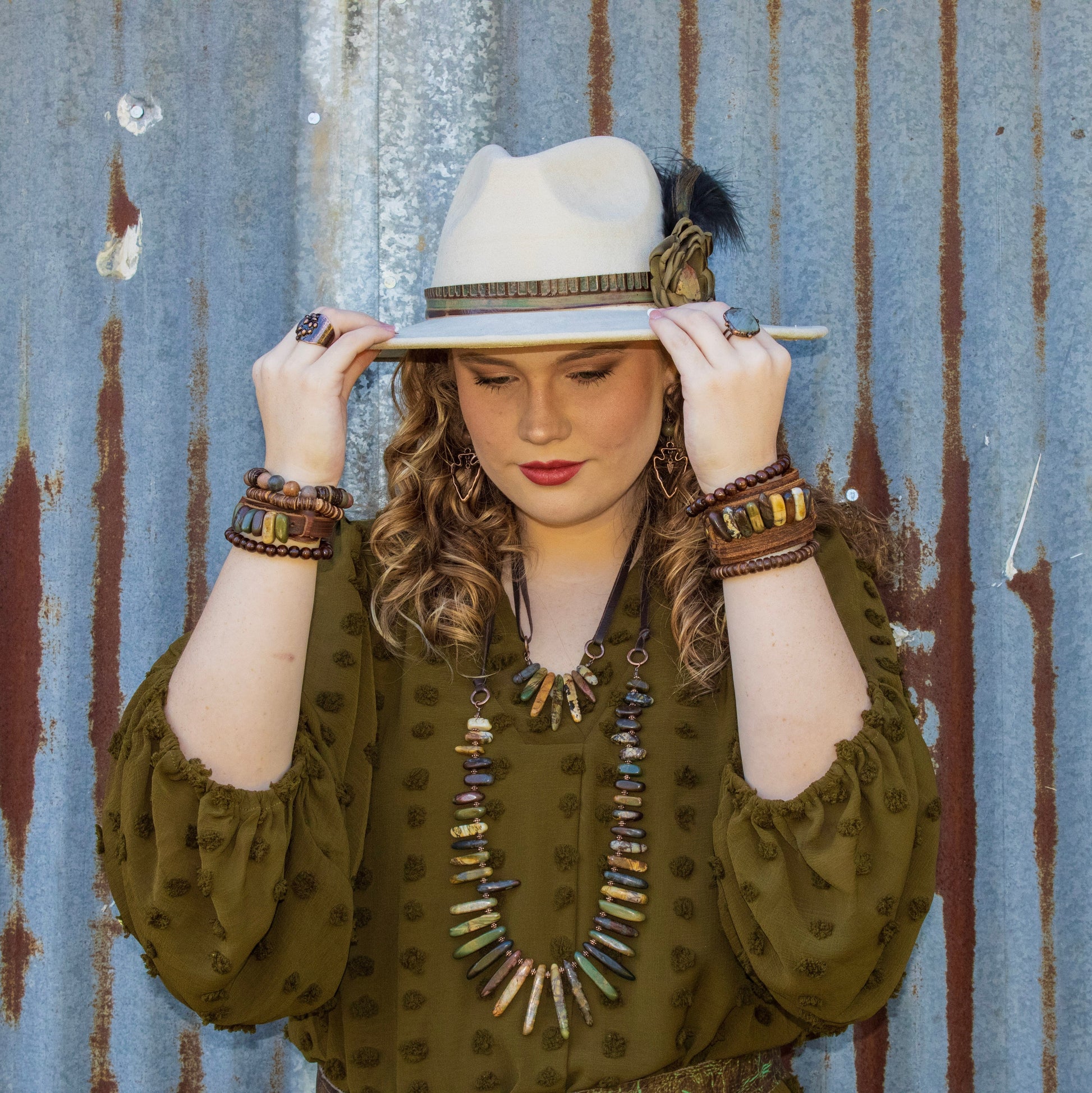 Experience the perfect blend of bohemian style and luxury with our Dusty Leather Cuff. Handcrafted using genuine leather, this cuff exudes a rustic charm. Adorned with unique Picasso Jasper Gemstone Chunks, it adds an exotic touch to any outfit. Elevate your look with this one-of-a-kind statement piece.