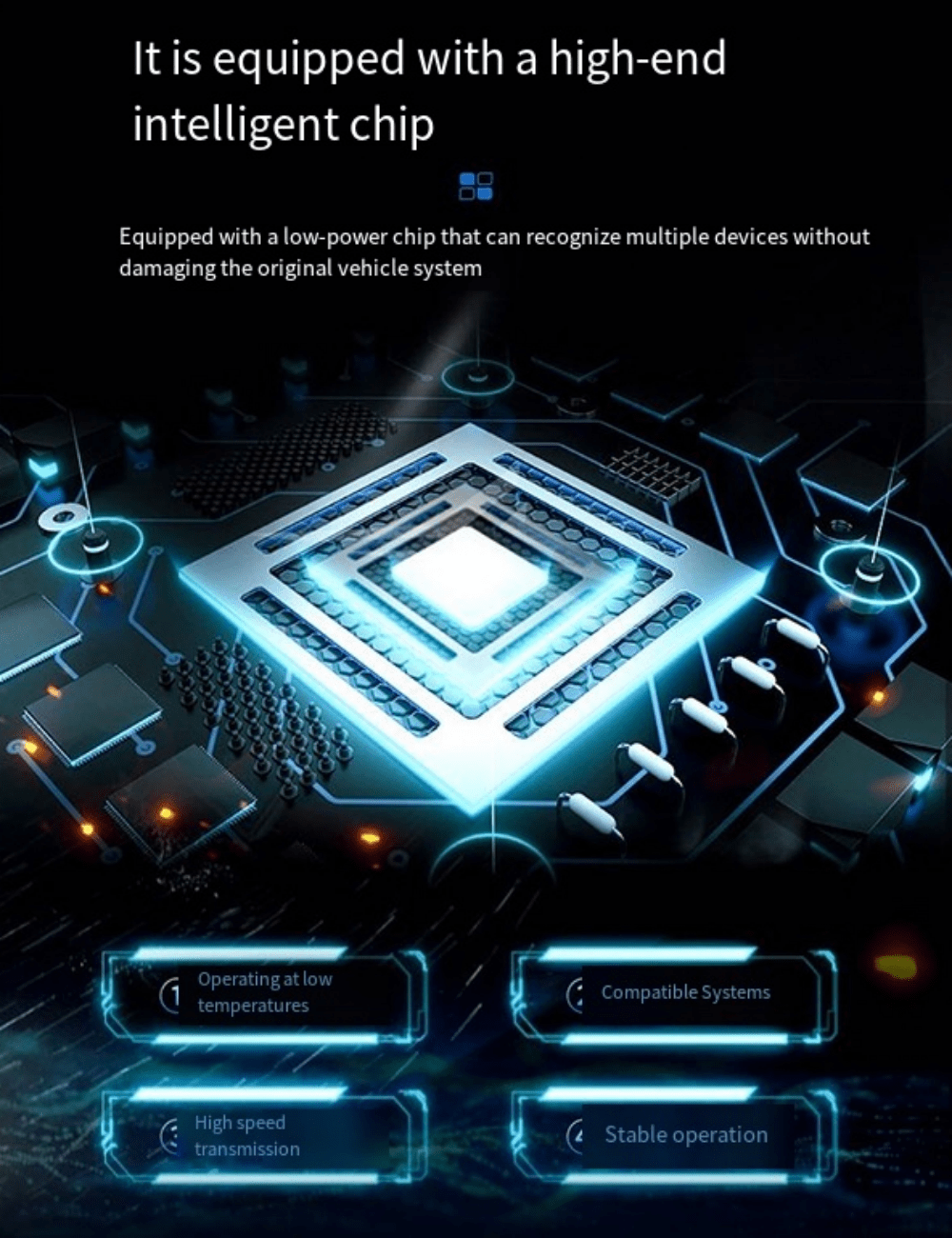 A: No, it features a built-in high-end smart chip designed for low power consumption, intelligent device recognition, and low-temperature operation to ensure system compatibility and protect your original vehicle system.