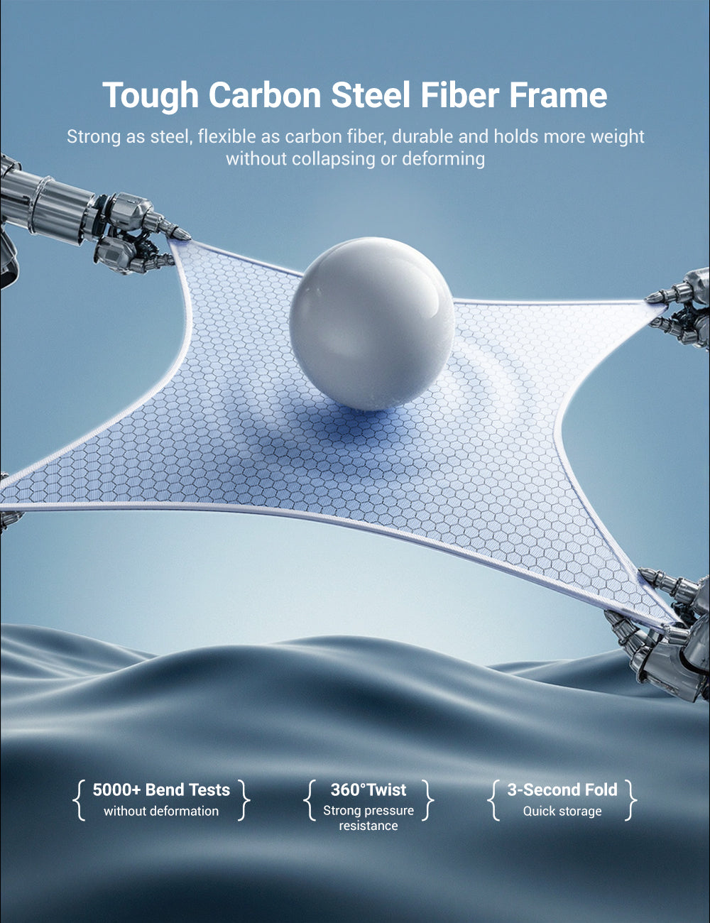 - ā Strong Carbon Steel Fiber Frame: Combines the hardness of steel with the flexibility of carbon fiber to create a robust, pressure-resistant frame that prevents collapsing and deformation, even with frequent use and storage.