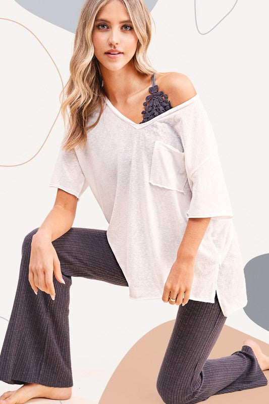 The perfect tee for any style! Our effortless top featured in a boxy and super relaxed fit, short sleeves, front patch pocket, pleated back detailing, high-low hemline with raw seaming throughout for a true lived-in look.