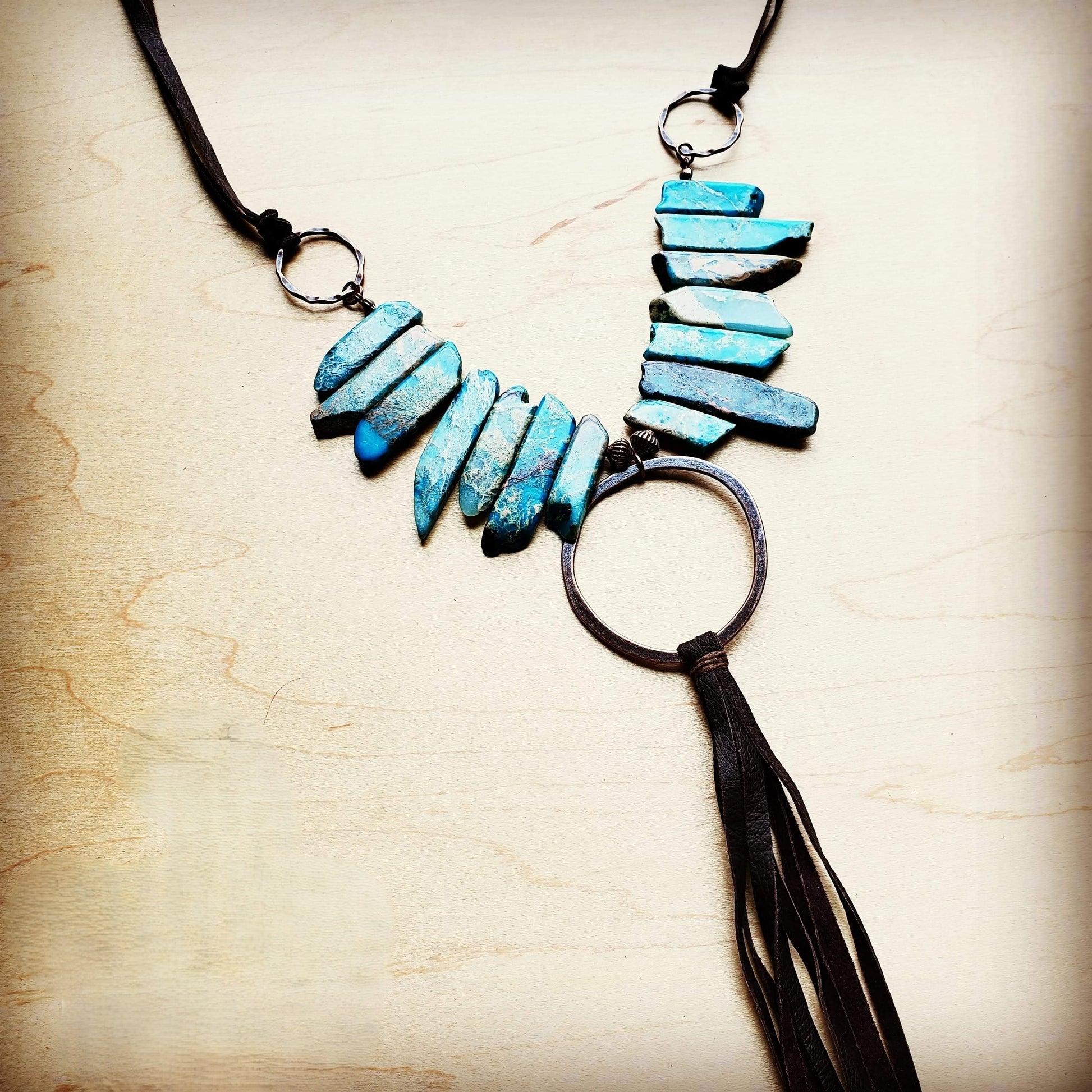 This Imperial Jasper Slab Necklace with Fringe Tassel combines vegan leather and genuine imperial jasper stones to create a boho chic style. Elevate any outfit with the unique and eye-catching design of this necklace. Perfect for those looking to add a touch of sophistication to their style.
