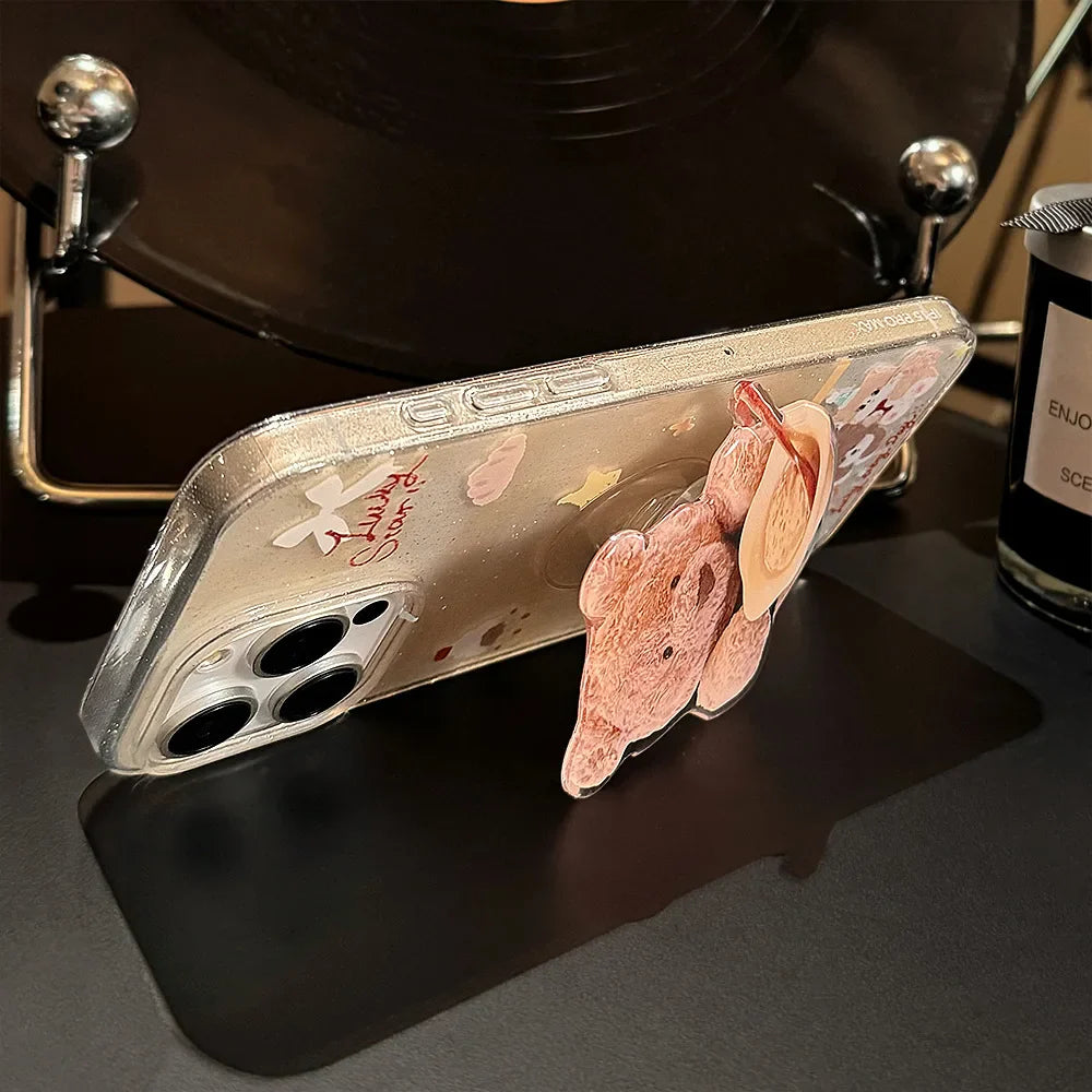 Bring a touch of whimsy to your daily routine with this adorable Korean-inspired dessert bear phone case. Featuring a charming bear design adorned with shimmering glitter accents, it transforms your iPhone into a delightful accessory that sparks joy. The integrated stand holder keeps your phone perfectly positioned for hands-free viewing, whether you're watching videos or video calling. Durable construction protects your device from everyday bumps and drops while maintaining its eye-catching appeal. Perfect for anyone who loves cute aesthetics and practical functionality combined.