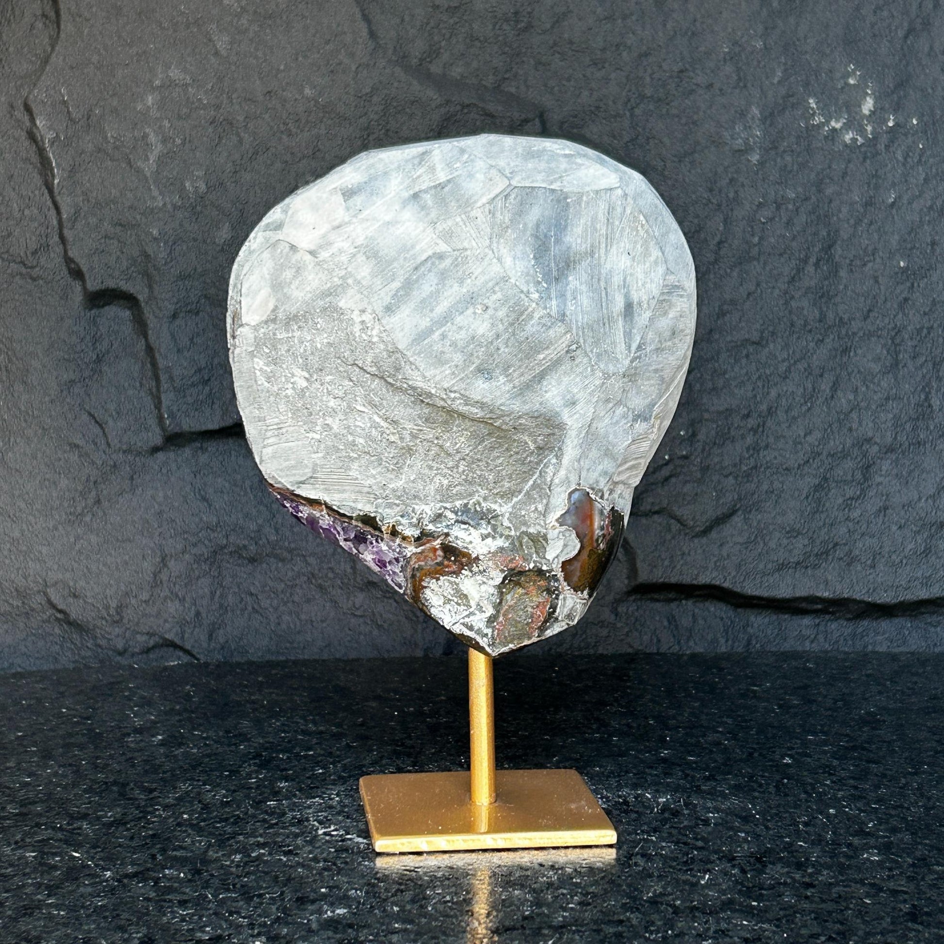 This large amethyst crystal on gold metal stand has the highest quality of the semi precious stones. Its colors are 100% natural.Combine design and wellness by adding crystals to the decoration of your spaces.This specimen is gorgeous from any angle, perfect for displaying as a centerpiece. It will look great from any location in the room.This amazing mineral formation was extracted from URUGUAY, one of the few places in the world where you can find. YOU WILL RECEIVE THE PIECE OF THE PICTURE! the metallic stand (in black shades) is included.ā§ MEASURES Approx:Height: 8 inWeight 5 Lb (2335 gr)