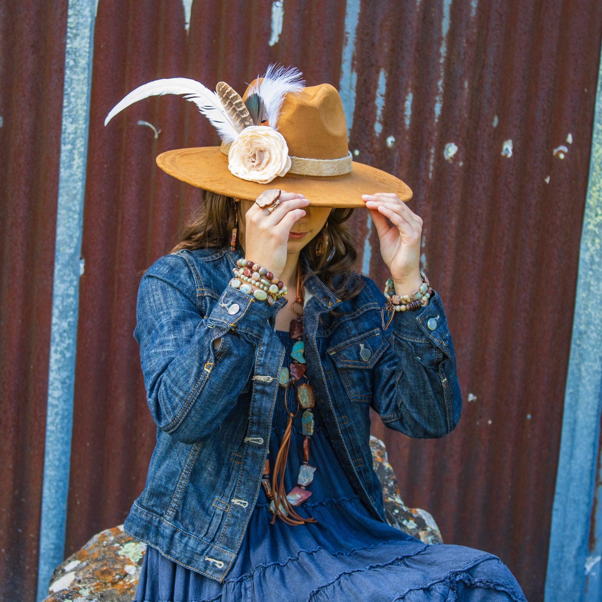 Add a touch of boho elegance to your favorite hat with this handcrafted leather hat band. Featuring a large soft silk flower and natural feathers in a warm hue, it offers a unique, stylish accent that enhances your look with effortless charm. Perfect for those who love distinctive, artisanal accessories that stand out.