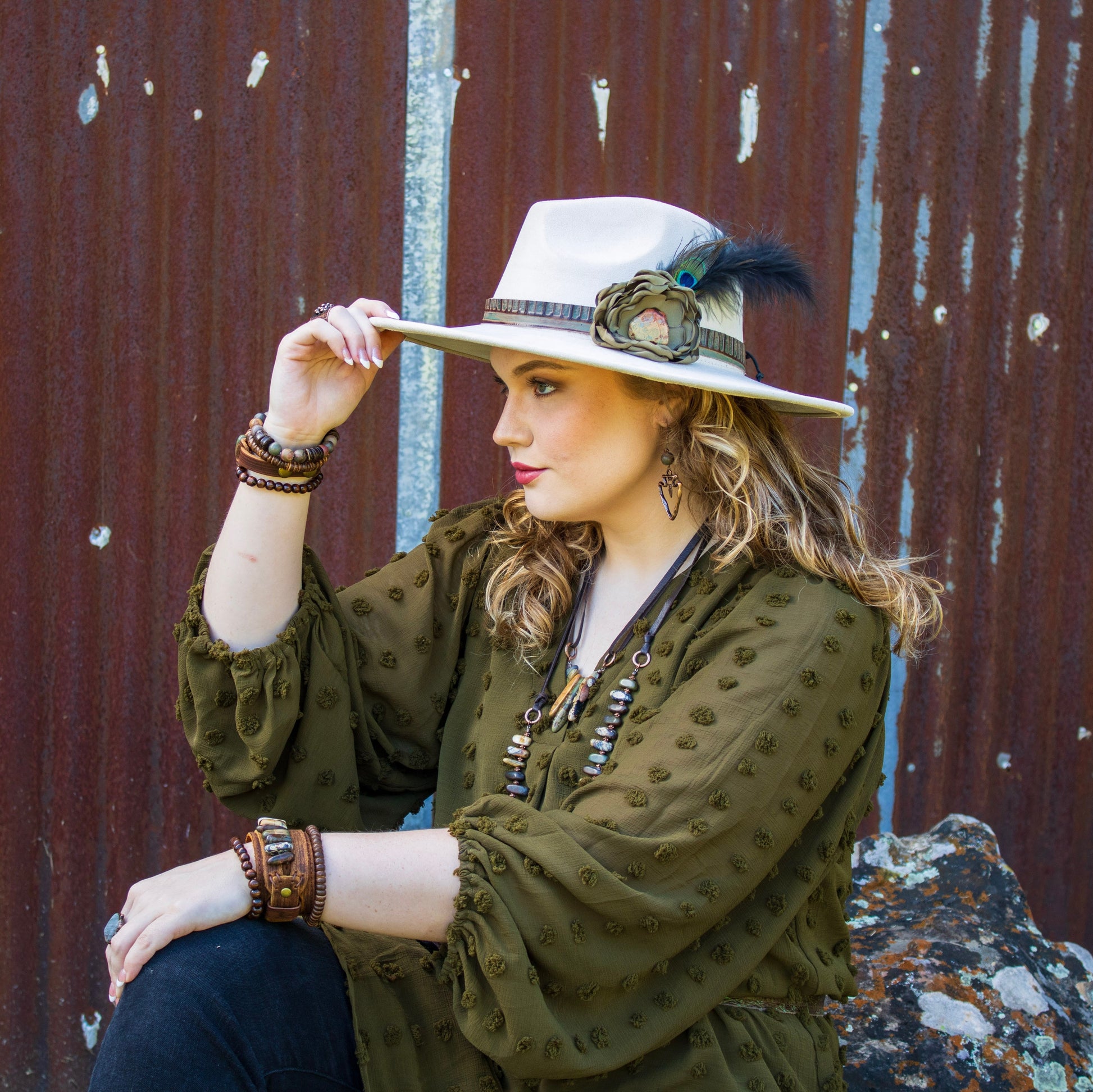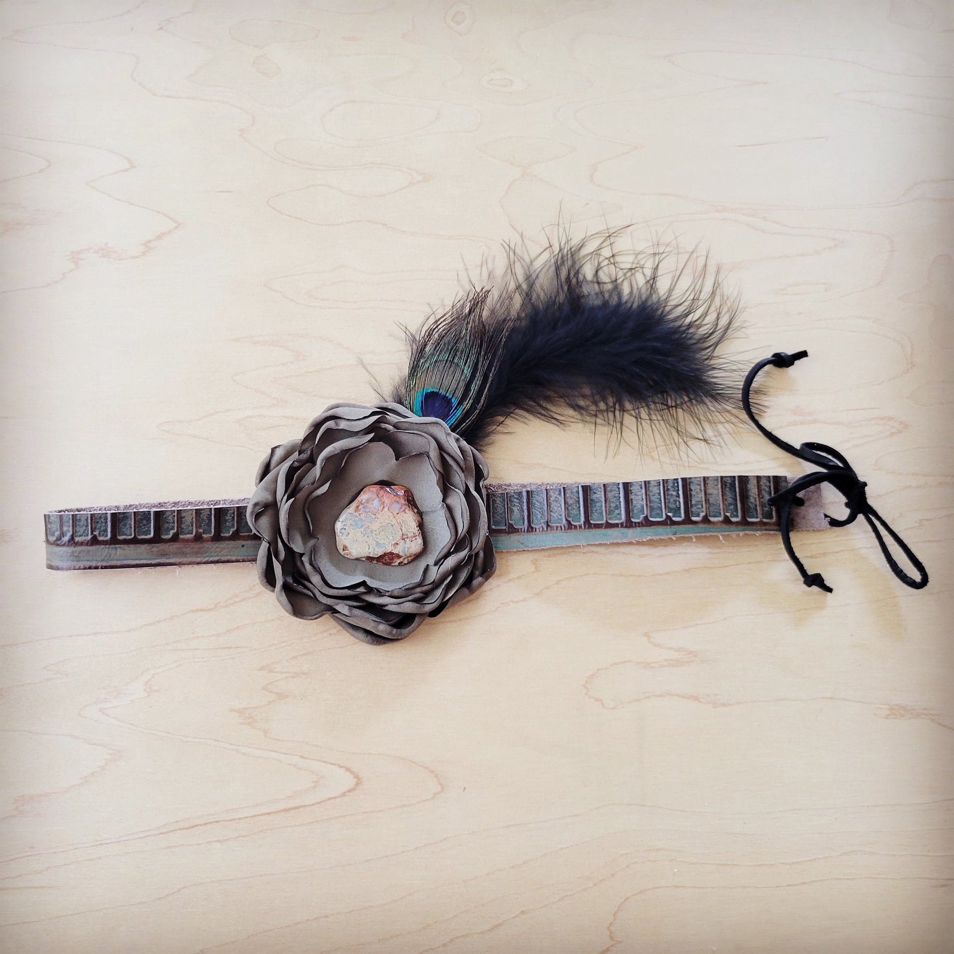 Add a touch of boho elegance to your favorite hat with this handcrafted leather hat band. Featuring a large soft silk flower and natural feathers in a warm hue, it offers a unique, stylish accent that enhances your look with effortless charm. Perfect for those who love distinctive, artisanal accessories that stand out.