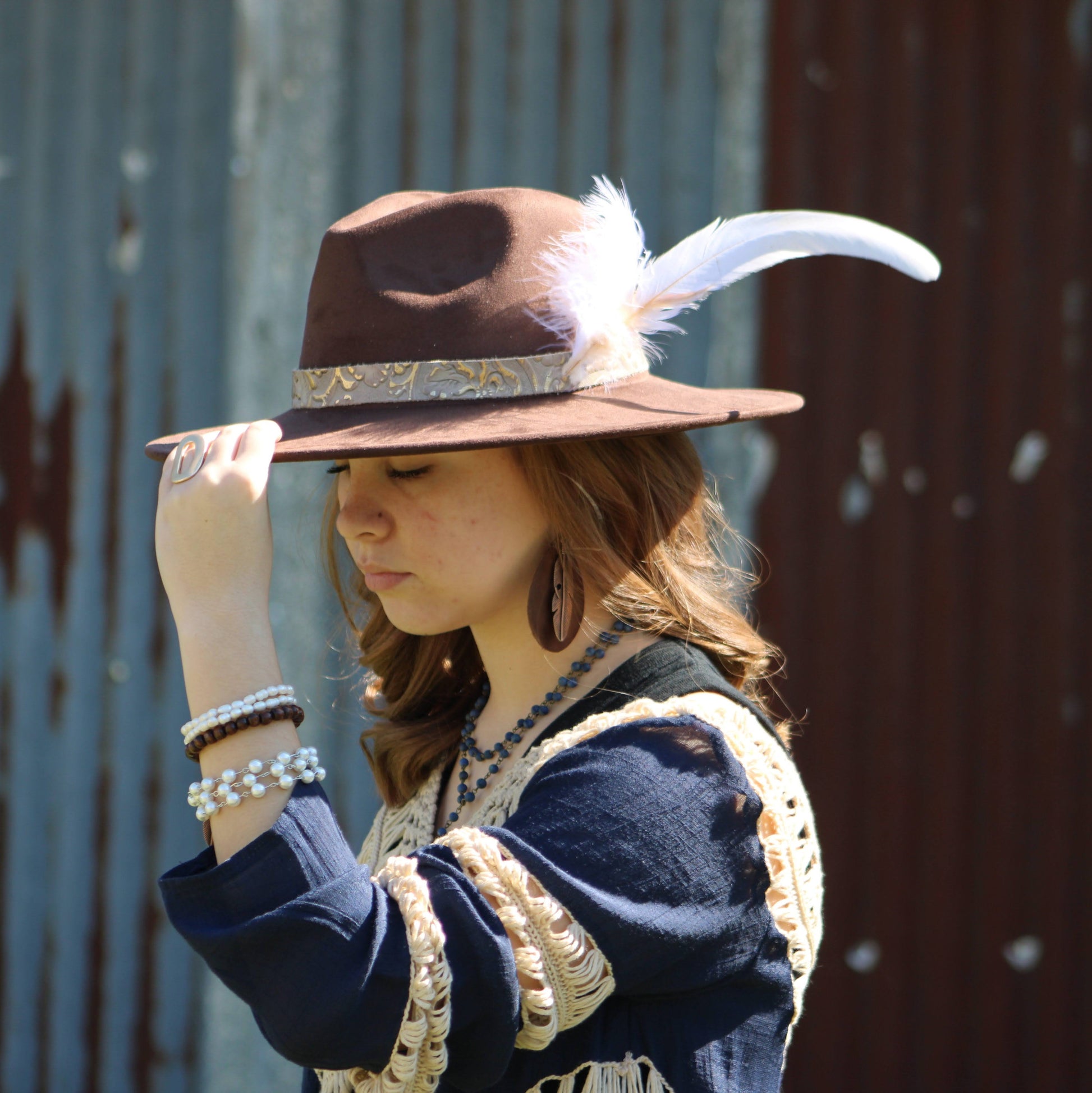 Leather Teardrop Earrings Brown w/ Copper Feather 208a