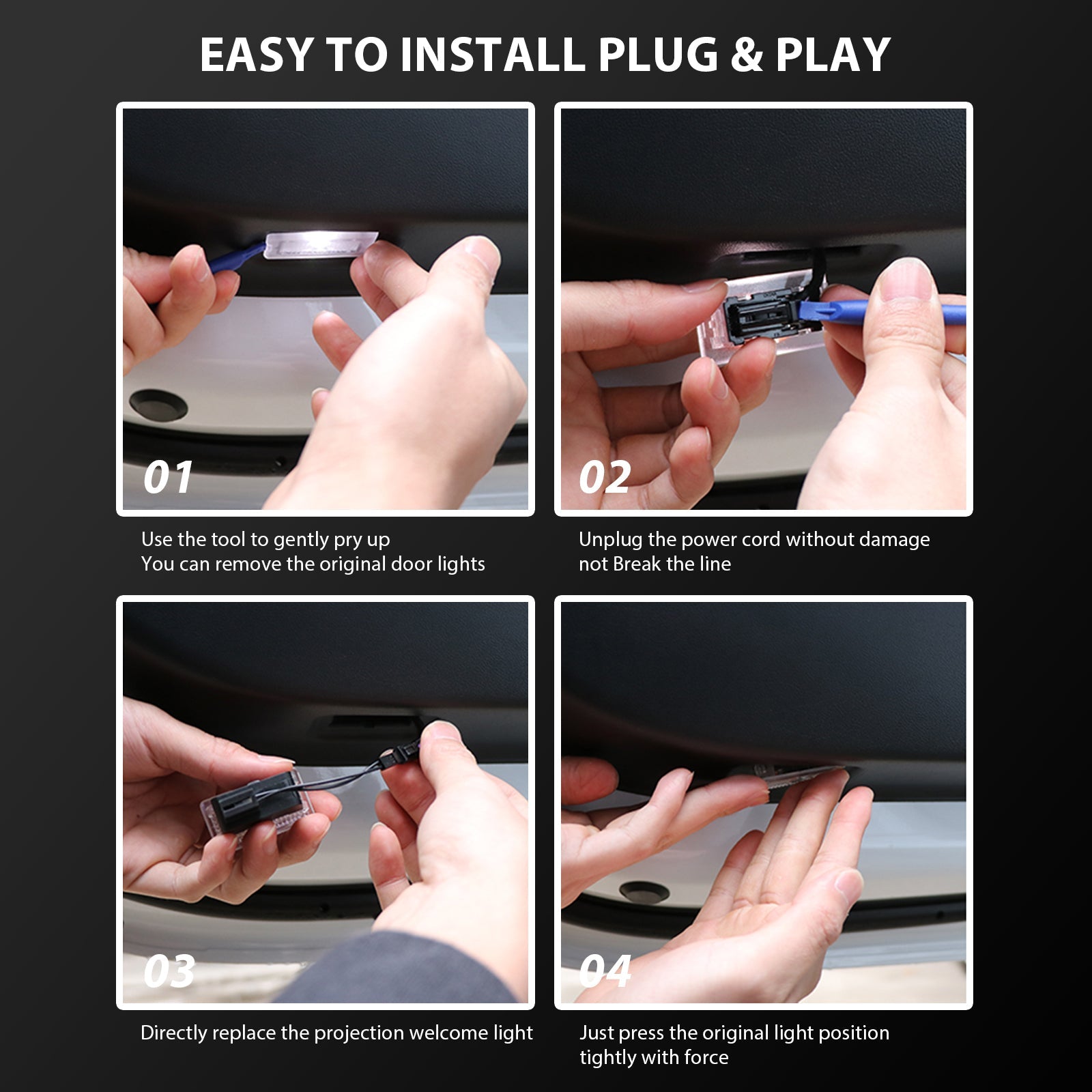 Easy To Install No drilling, no wiring, no damage to your car. The installation is very simple, and the original door lights can be replaced directly |