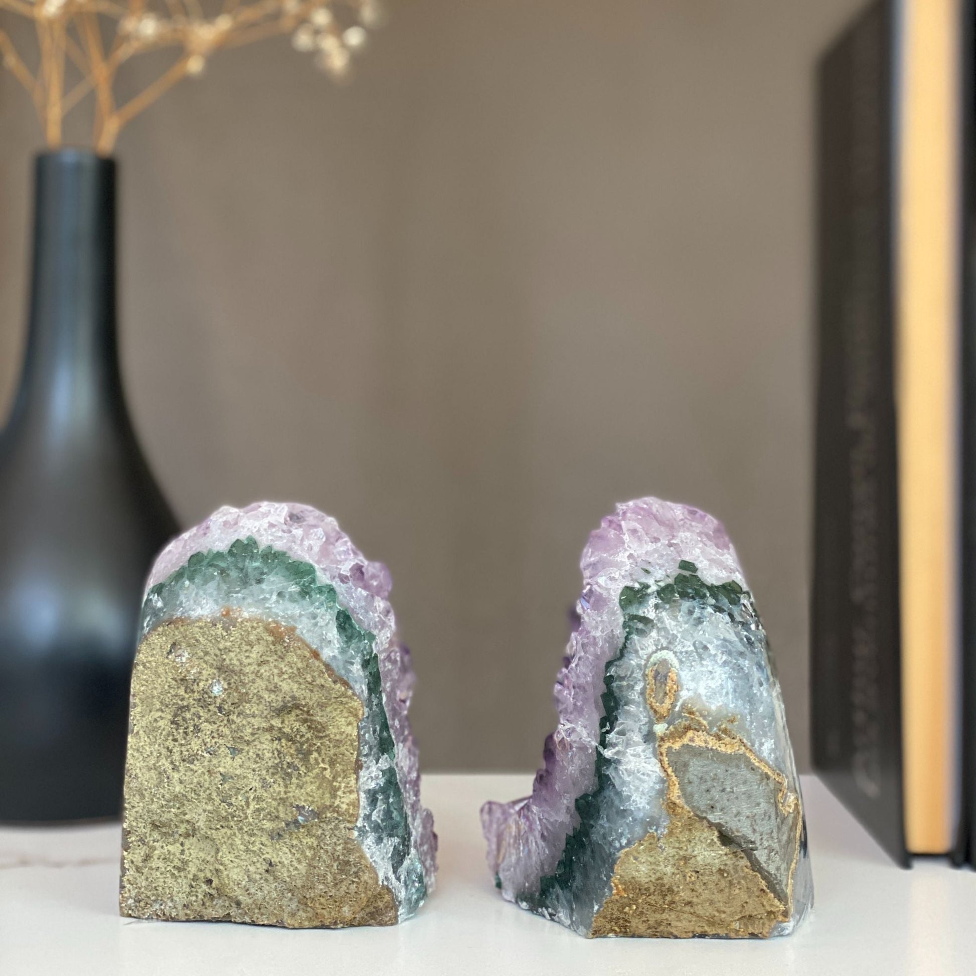 This lovely Amethyst set is perfect for displaying on a bedside table or as a gift for a lover of crystals. It has beautiful green and gray agate bands at edges.