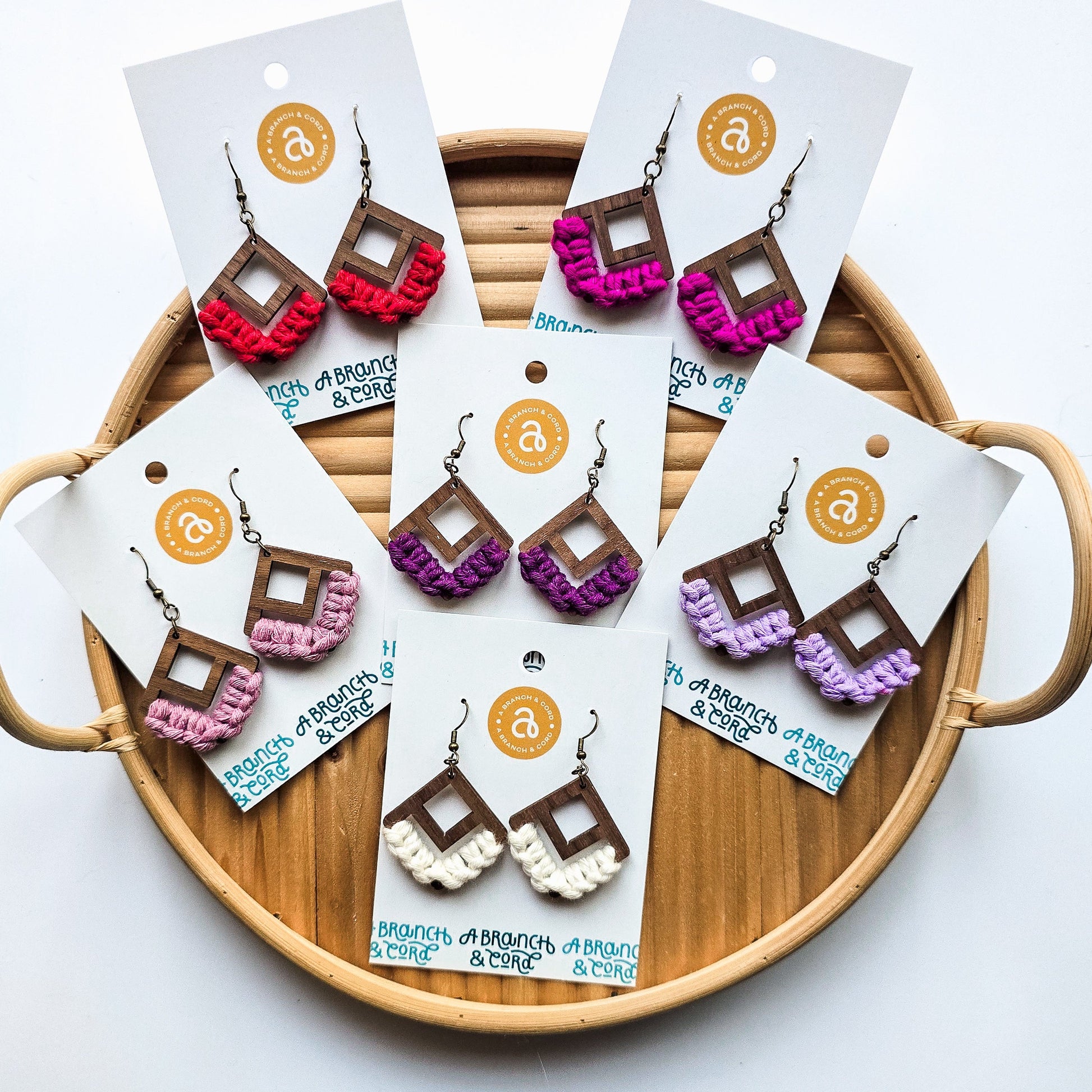 Macrame knotted earrings are perfect for those who want the boho touch but want a smaller statement than fringe earrings. They are hypoallergenic and shockingly lightweight. The wooden blanks are laser by one of our very own shop helpers! Once a customer grabs a pair they can't help but come back to add colors to their collection.