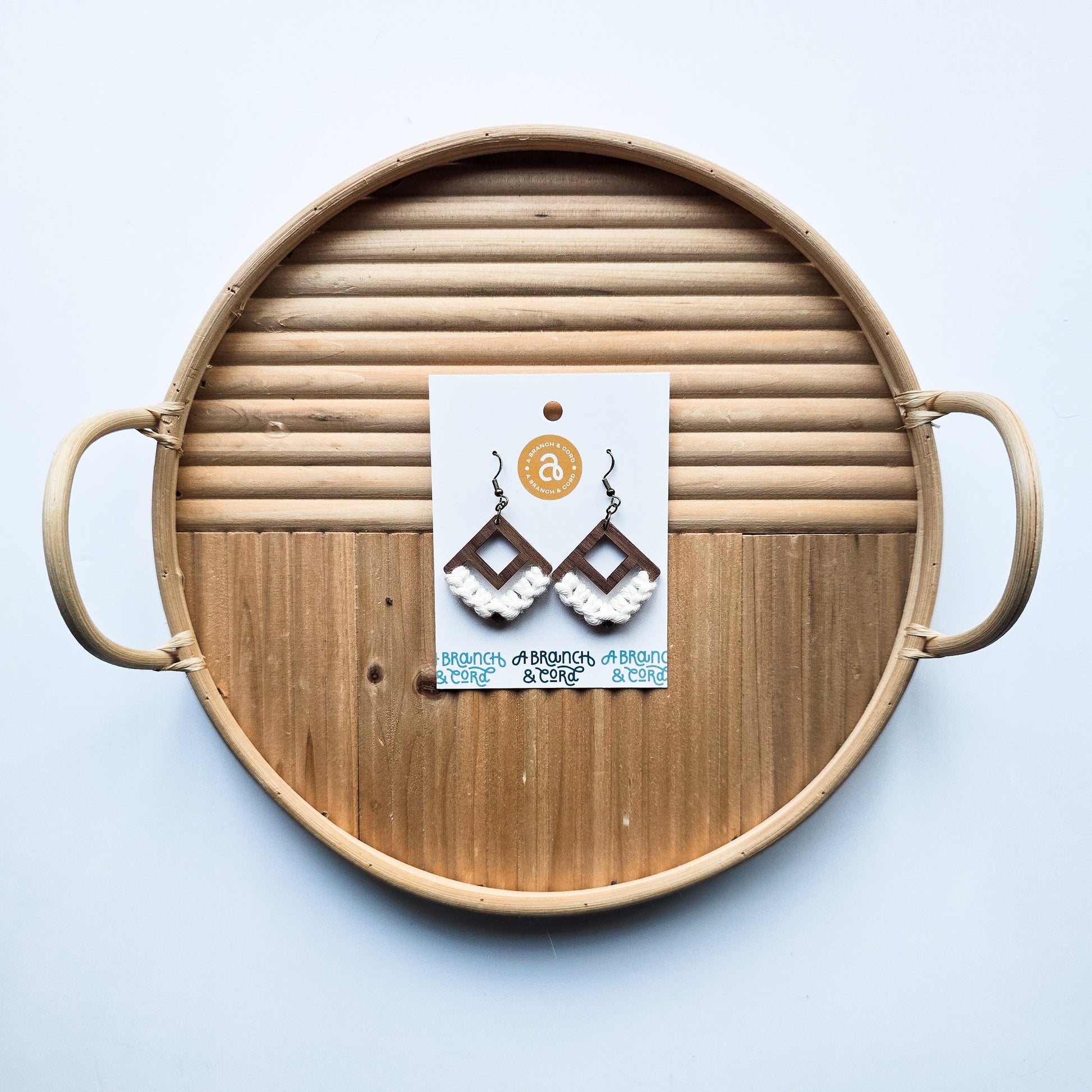 Handmade with 100% cotton cord, wooden earring blanks, and bronze, hypoallergenic earring hooks.