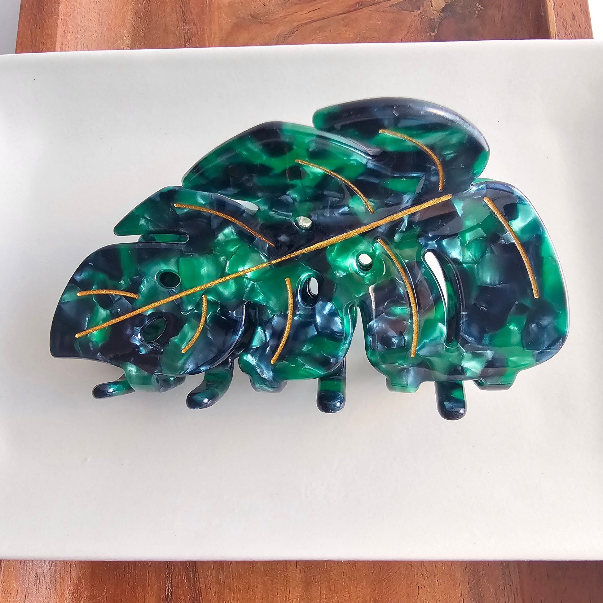 Add a tropical touch to your hairstyle with this stunning Monstera Leaf Hair Claw. Designed for style and practicality, this piece brings a fresh, botanical vibe to your everyday look. Its intricate Monstera leaf shape captures the beauty of nature while providing a secure hold. Perfect for creating effortless updos or half-up styles, this accessory blends elegance and functionality seamlessly. Whether you're heading to brunch, the beach, or the office, this hair claw is your go-to for a chic, nature-inspired look.