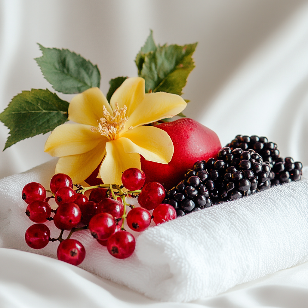 It opens with the sweet-tart sparkle of red berries, blackberry, and cassis, a burst of fruity brightness that lifts the senses. At its heart, cherry blossom blooms softly, adding a touch of romance to the mix. As the fragrance deepens, a grounding of smooth teakwood lends warmth and sophistication, anchoring the airy top notes with a subtle richness.