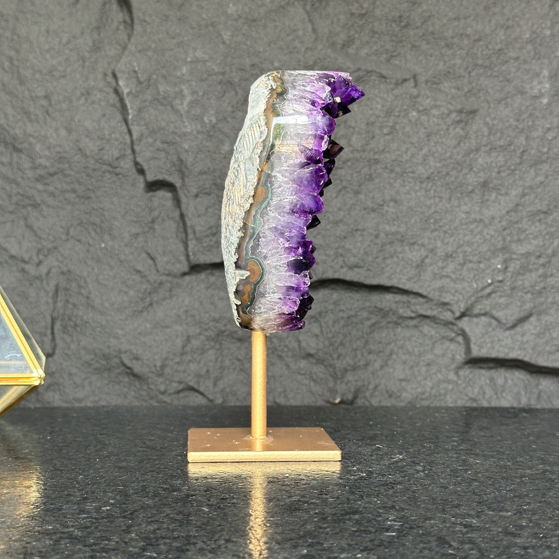 These natural amethyst geode on metal stand has the highest quality of the semi precious stones. Its colors are 100% natural.Combine design and wellness by adding crystals to the decoration of your spaces.This specimen is gorgeous from any angle, perfect for displaying in an entry table or library. It will look great from any location in the room.These amazing mineral formation was extracted from URUGUAY, one of the few places in the world where you can find. YOU WILL RECEIVE THE PIECE OF THE PICTURE! the metallic stand (in black shades) is included.✧ MEASURES approx:Height: 7 inches stand included Weight 2.6 Lb (1208 gr.)
