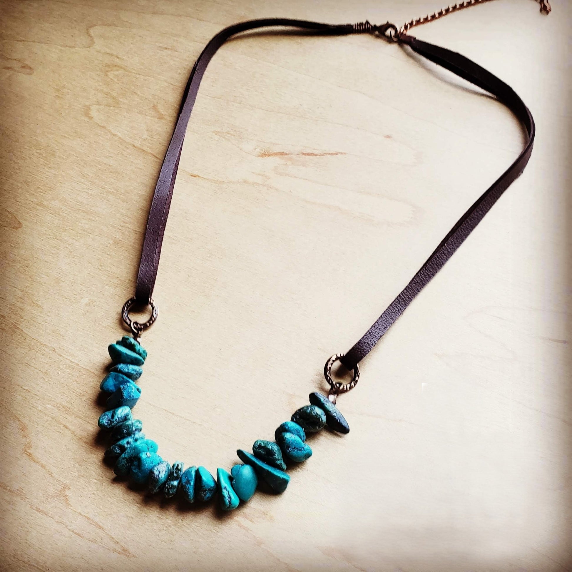 Unleash your boho style with this handcrafted Natural Turquoise Leather Cord Necklace! Made with genuine gemstones, it adds a touch of natural beauty to any outfit. Express your individuality with this artisan piece that exudes passion and energy. Elevate your look with this necklace.